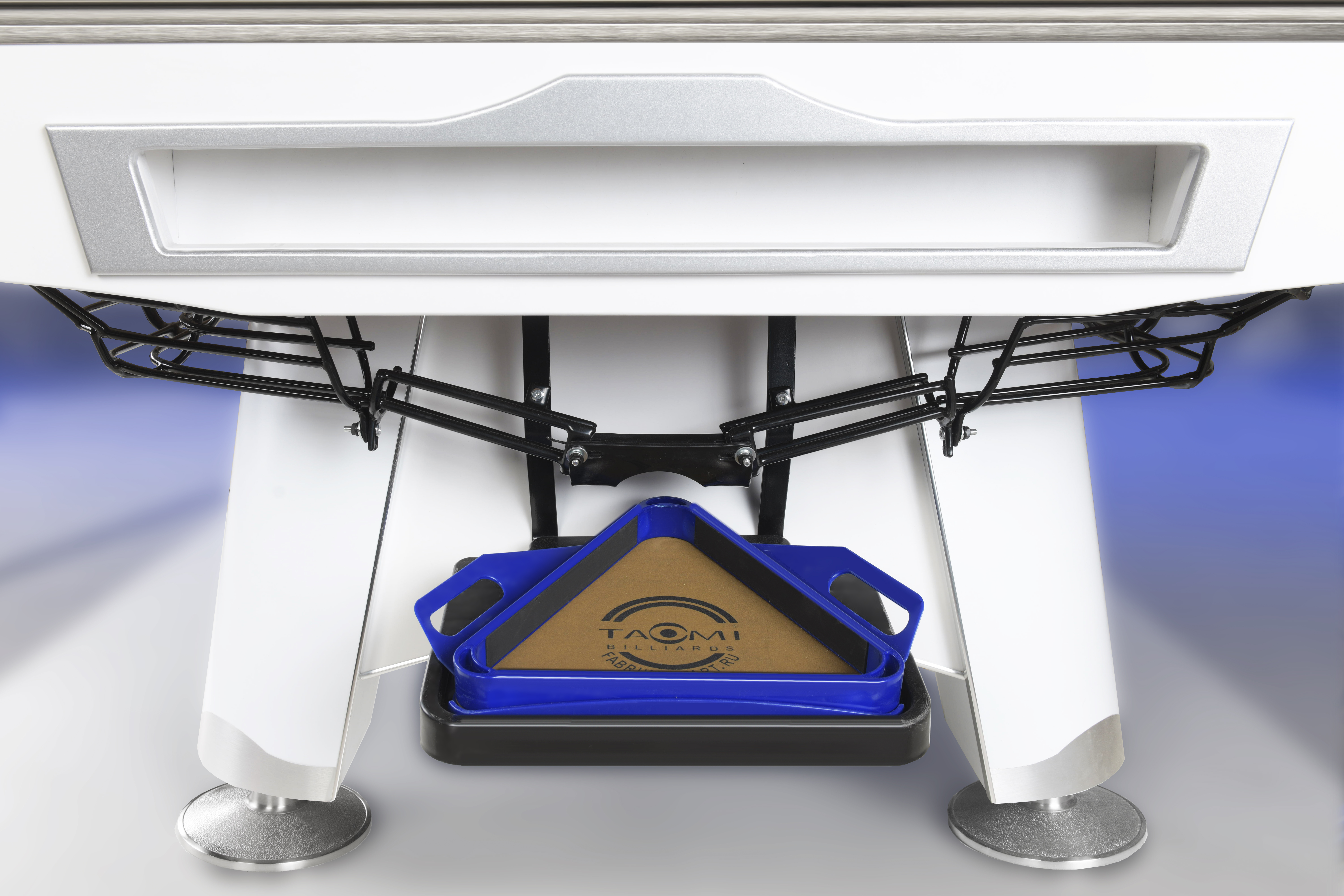Стол оборудован системой выкатов для шаров - все забитые шары скатываются в треугольник на специальном поддоне, и сразу готовы для следующей игры после окончания партии.