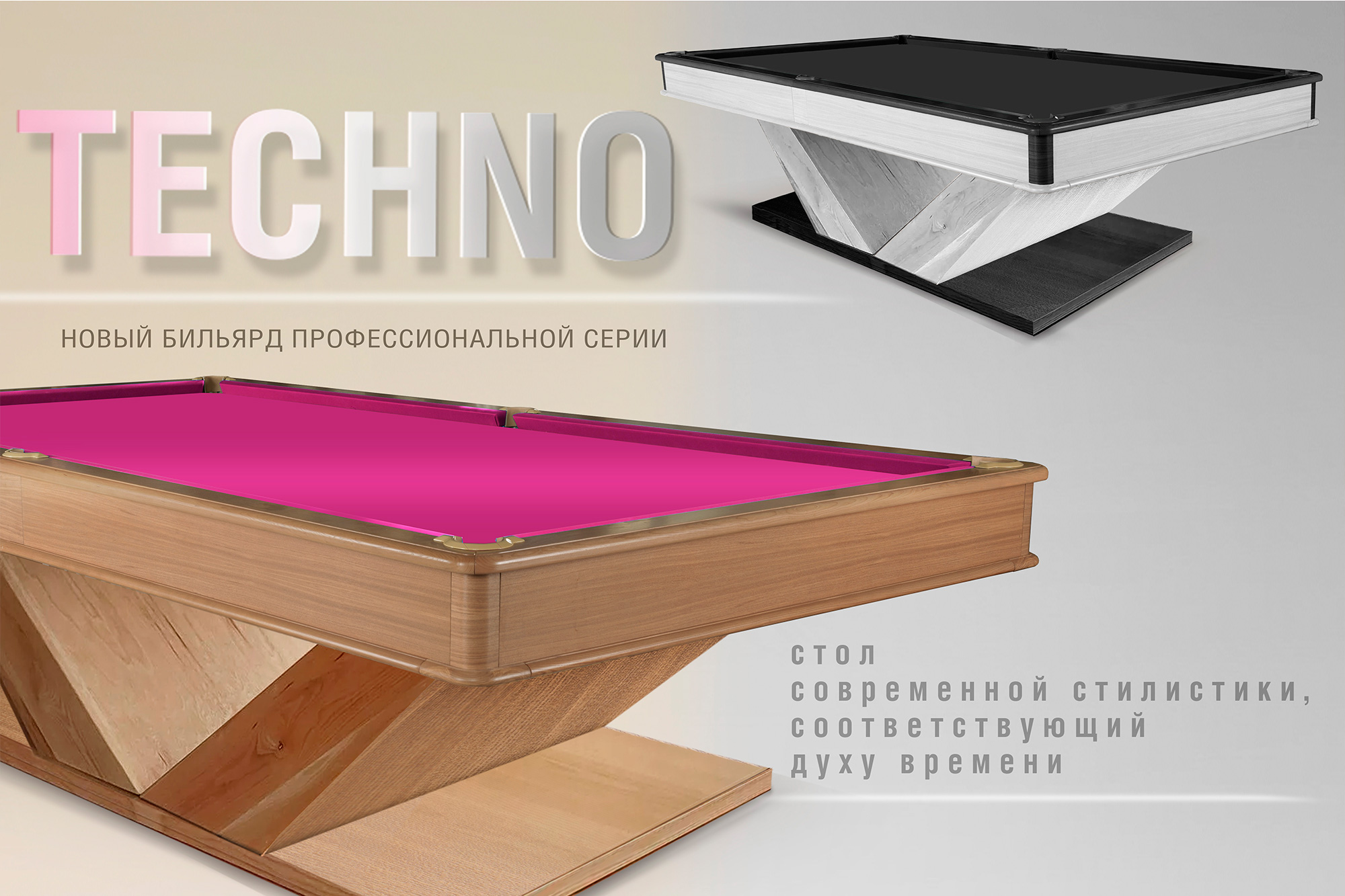Бильярд Techno – один из самых ярких представителей столов современной стилистики. Композиция стола строится на четком ритме прямых линий, плоскостей и граней. Выразительный силуэт V-образных ног задает характер этому столу и добавляет визуальной легкости конструкции.Строгая геометрия сочетается в этом бильярде с превосходными игровыми характеристиками. В стол интегрирована несущая металлическая рама, благодаря которой он максимально статичен. Металлокаркас обеспечивают неподвижность конструкции, дает максимально точный отскок шара и исключает деформацию дерева от перепадов влажности и температуры. Такой стол не требует постоянного контроля болтовых соединений.Techno изготавливается из ценных пород дерева, укомплектован лучшими материалами: высококачественная бортовая резина Start Super Pro, сукно Manchester 70 wool Yellow green competition, природный сланец ORERO или камень Super Stone в основе игрового поля. Лузы бильярдного стола закрыты и способны выдерживать длительные игровые нагрузки.
