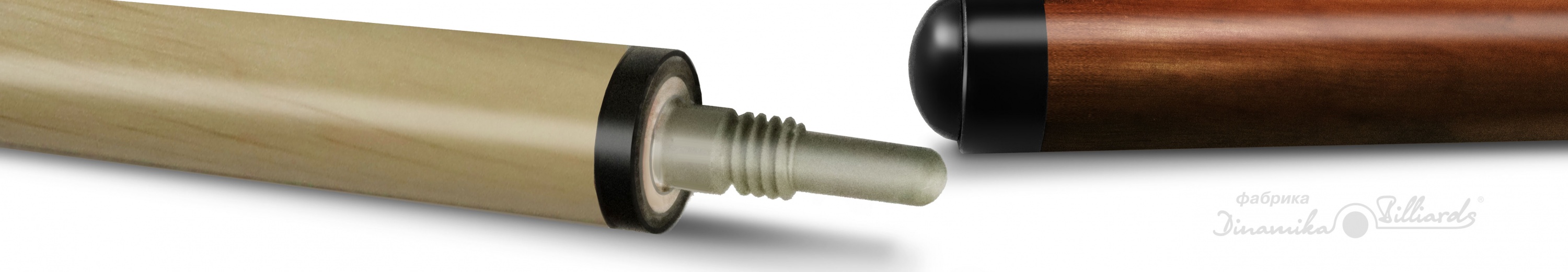 В двусоставных киях установлены специальные замки из прочного полимерного материала – собственная разработка Фабрики. Соединяя турняк и шафт, эта деталь обеспечивает идеальную скрутку, а также участвует в процессе замедления энергии, гася колебания, идущие в тыльную часть турняка, где уже находится груз. Использование цельного лепестка без склейки в построении кия обеспечивает стабильность, прочность, устойчивость изделия к искривлению.