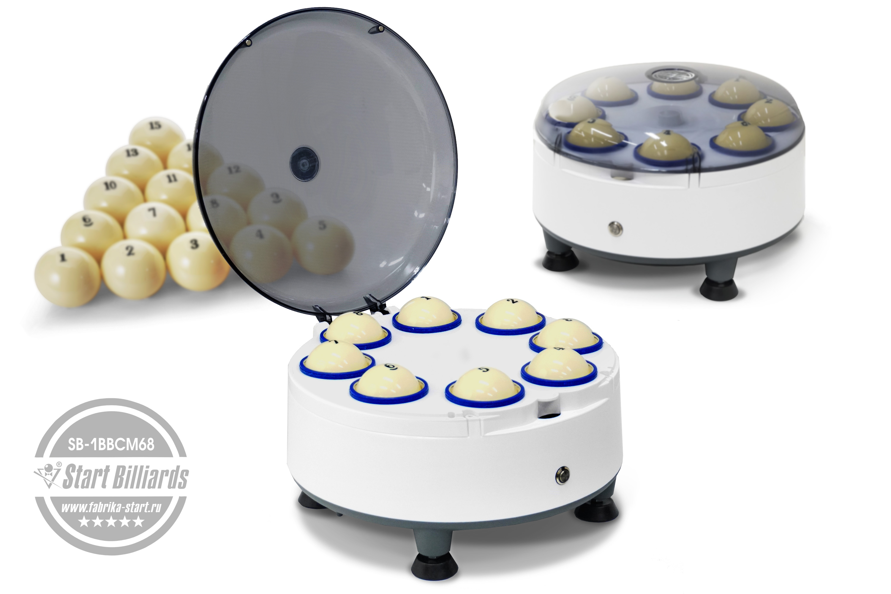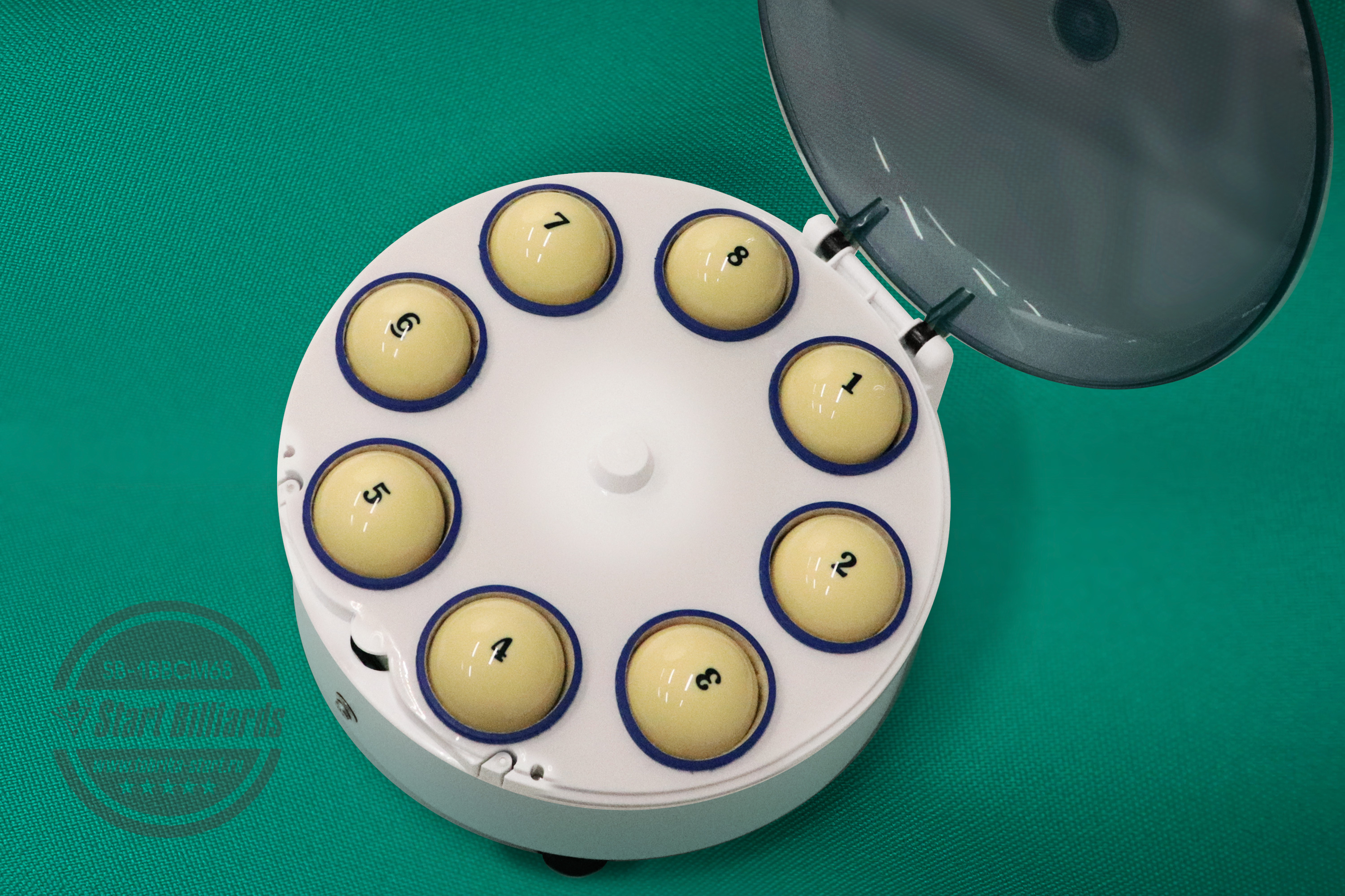 1. Загрузка: Откройте крышку устройства и поместите в отверстия для загрузки (диаметр 70-71 мм) до 8 бильярдных шаров.
