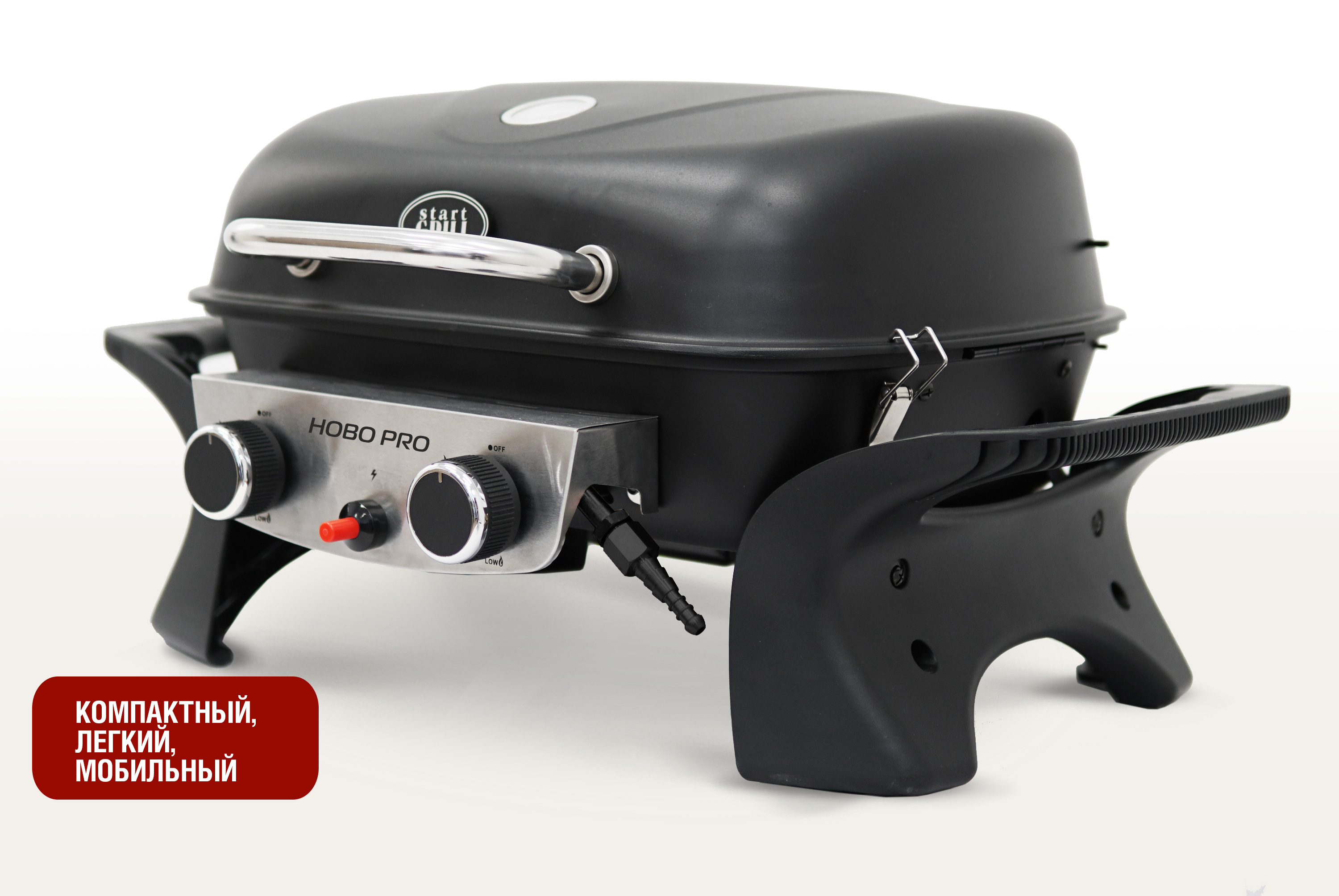 Преимущества HOBO PRO включают две горелки для более мощного и равномерного нагрева, встроенный термометр для контроля процесса готовки, а также пьезоподжиг для удобного разжигания. Гриль работает от стационарного газового баллона с российским соединением, и в комплекте поставляются шланг и регулятор.