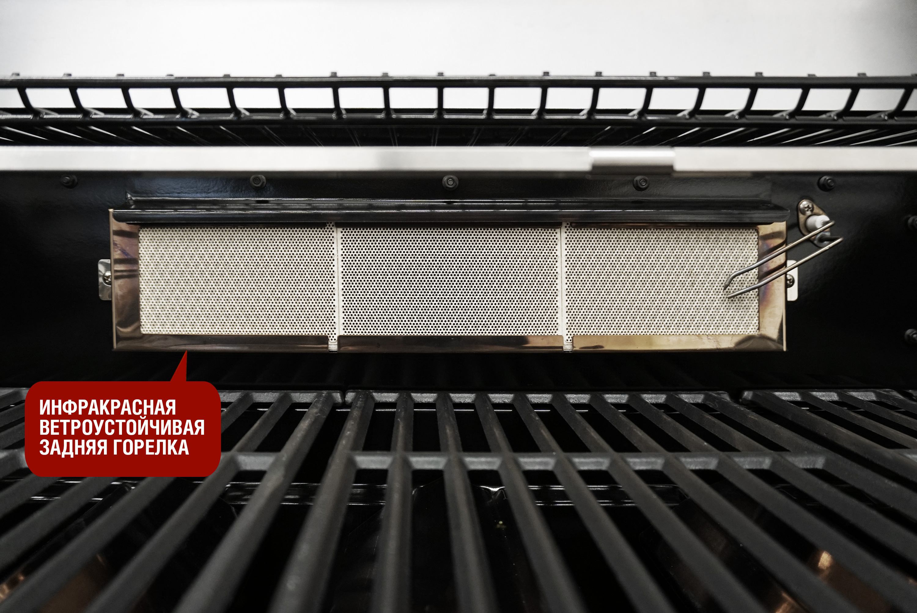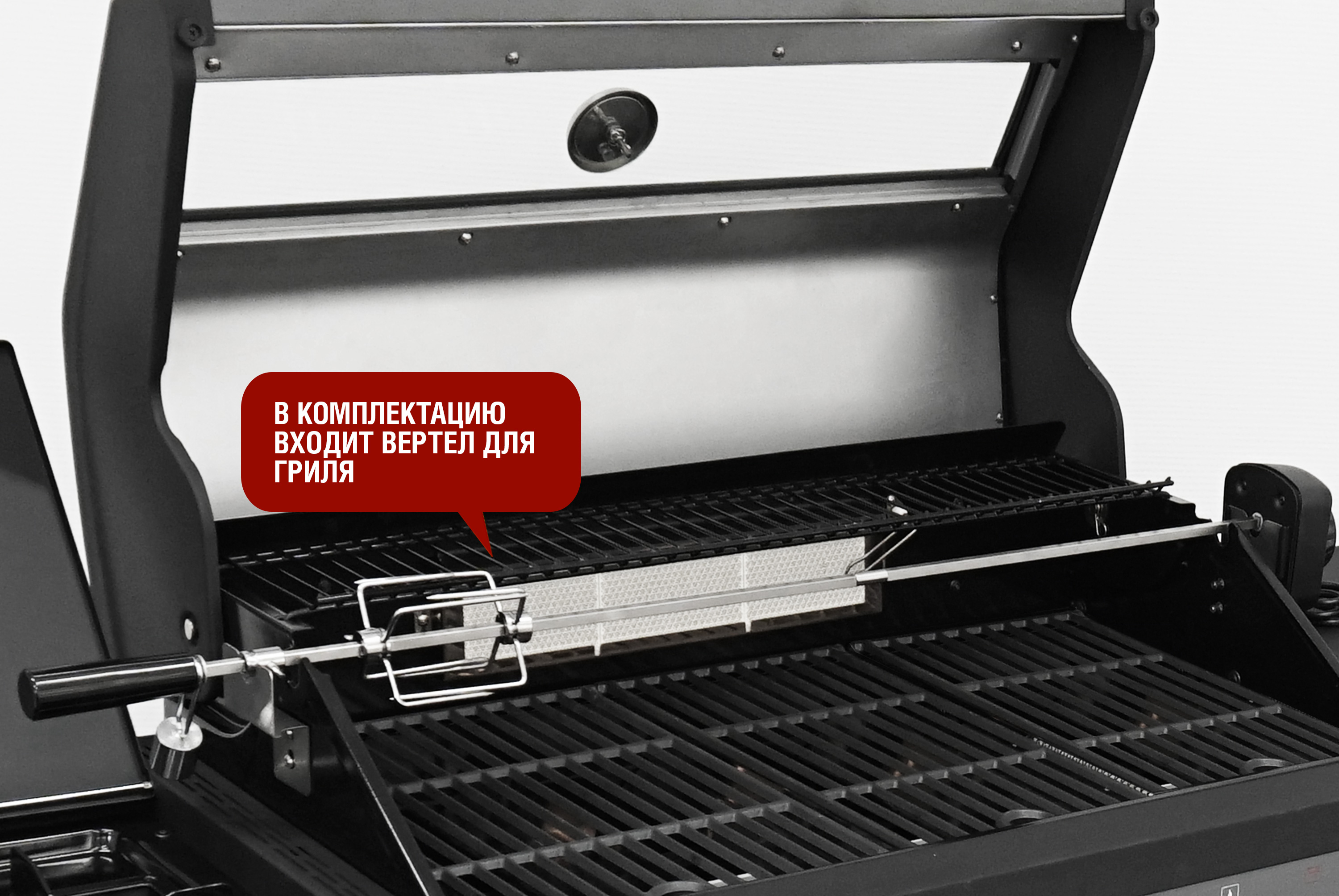 Гриль в базовом оснащении уже комплектуется электрическим вертелом. Дополнительная задняя инфракрасная горелка станет полезным атрибутом для быстрого запекания при использовании вертела.