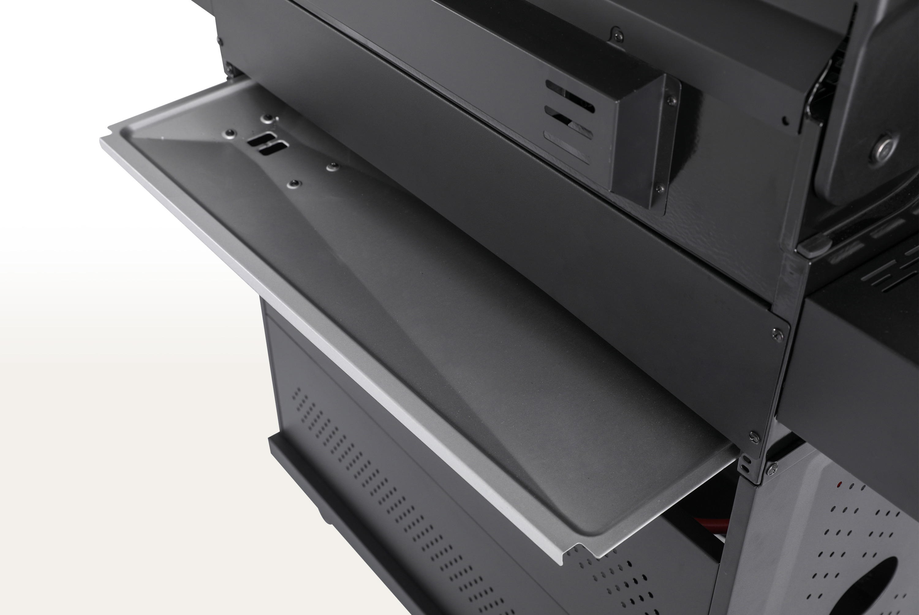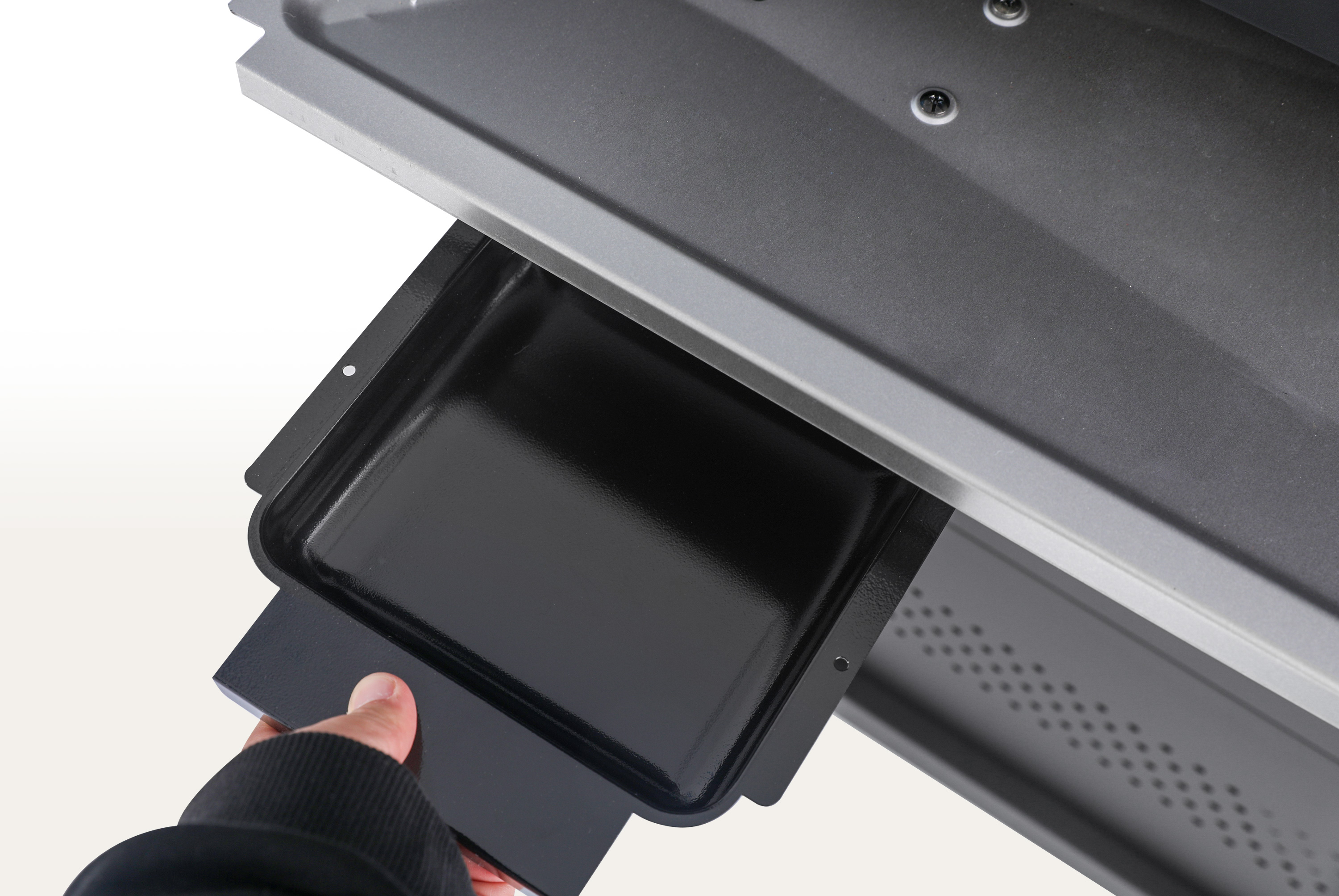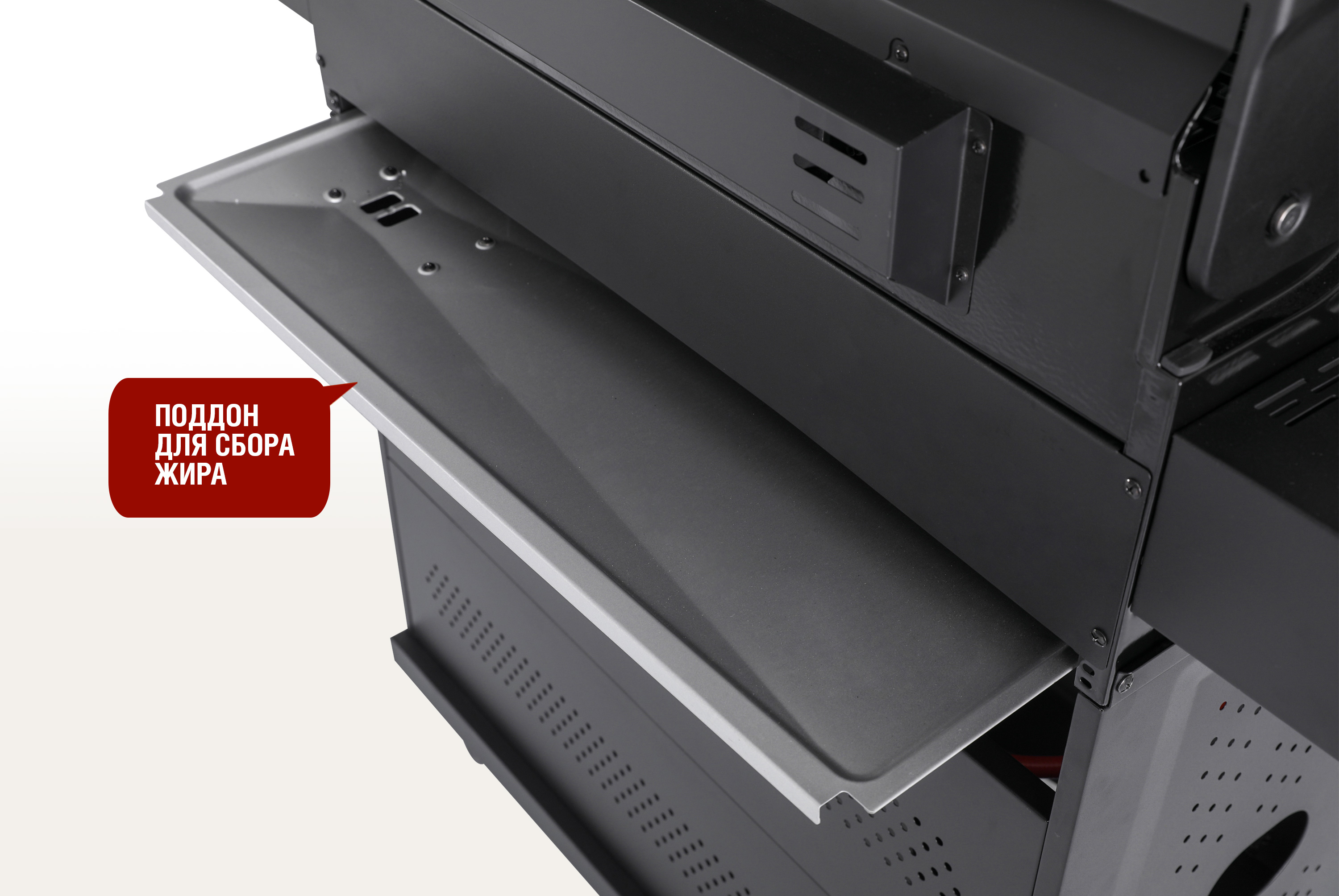 На боковой стенки гриля предусмотрено два удобных аксессуара: это держатель полотенца и лоток для хранения специй и соусов, что неоспоримо скажется на комфорте и удобстве использования гриля. Также на боковом столике лаконично расположились крючки для размещения различных аксессуаров. Для сбора жира предусмотрено два поддона: основной и маленький дополнительный для быстрой очистки.