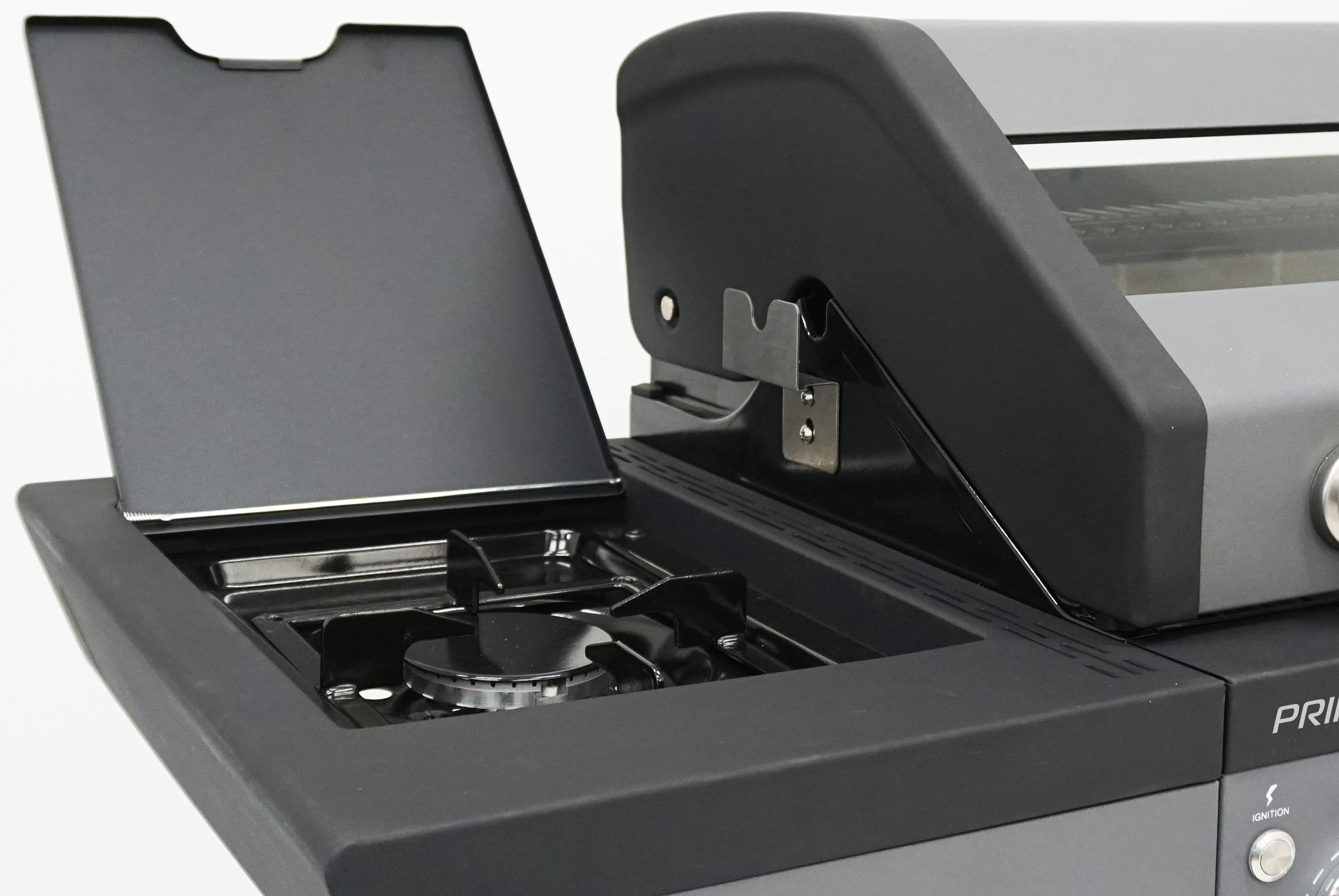 Дополнительная горелка, встроенная в боковой столик, также станет незаменимым помощником в приготовлении любимых блюд. Решетка боковой горелки изготовлена из чугуна.