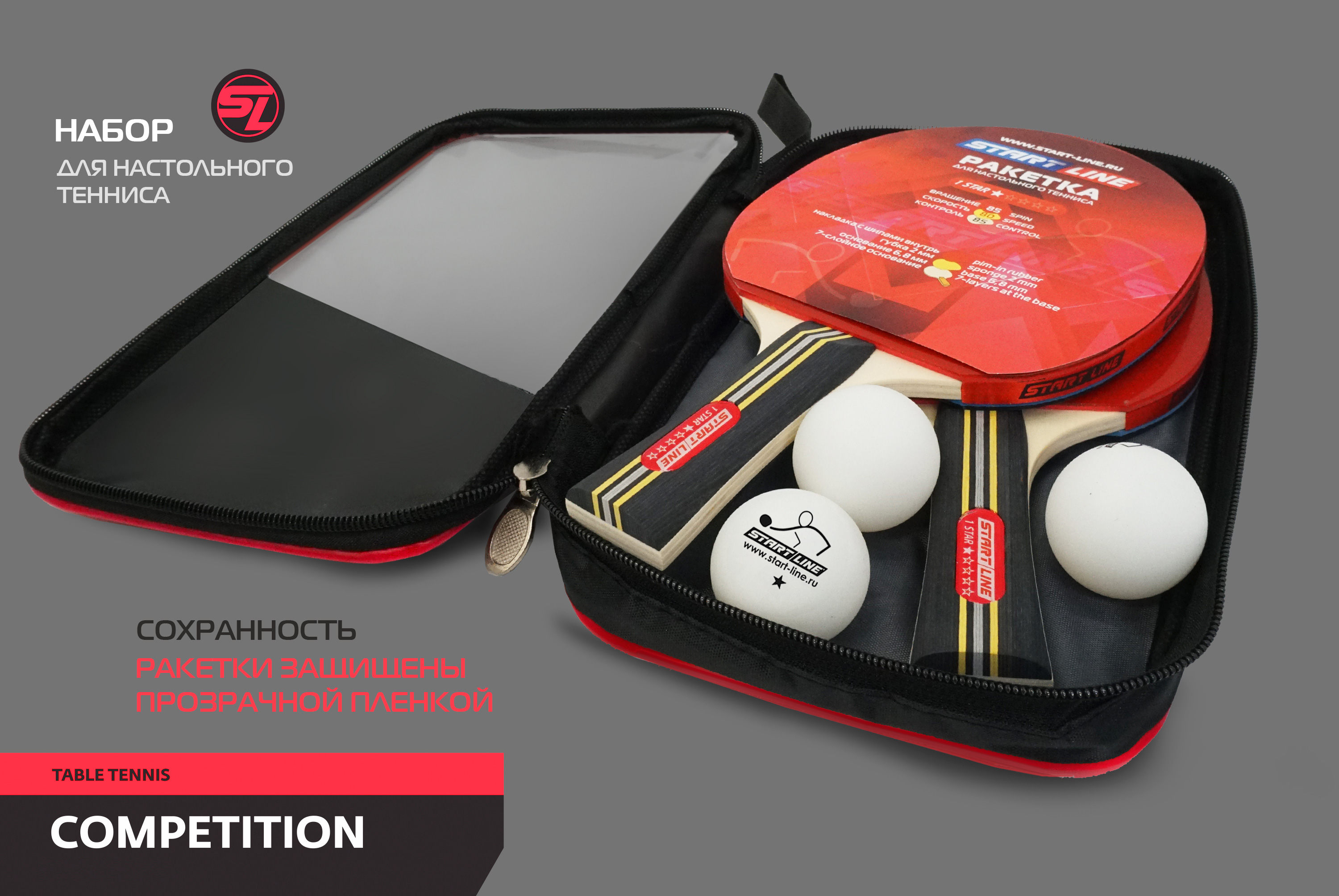 Набор для настольного тенниса Startline COMPETITION включает 2 ракетки и 3 мяча. Start Line заботится о сохранении продукции и удобстве игроков, поэтому набор упакован в компактную сумку с ручкой и замком-молнией. Набор удобно брать собой, а целостность инвентаря сохранится. Ракетки дополнительно защищены прозрачной плёнкой.