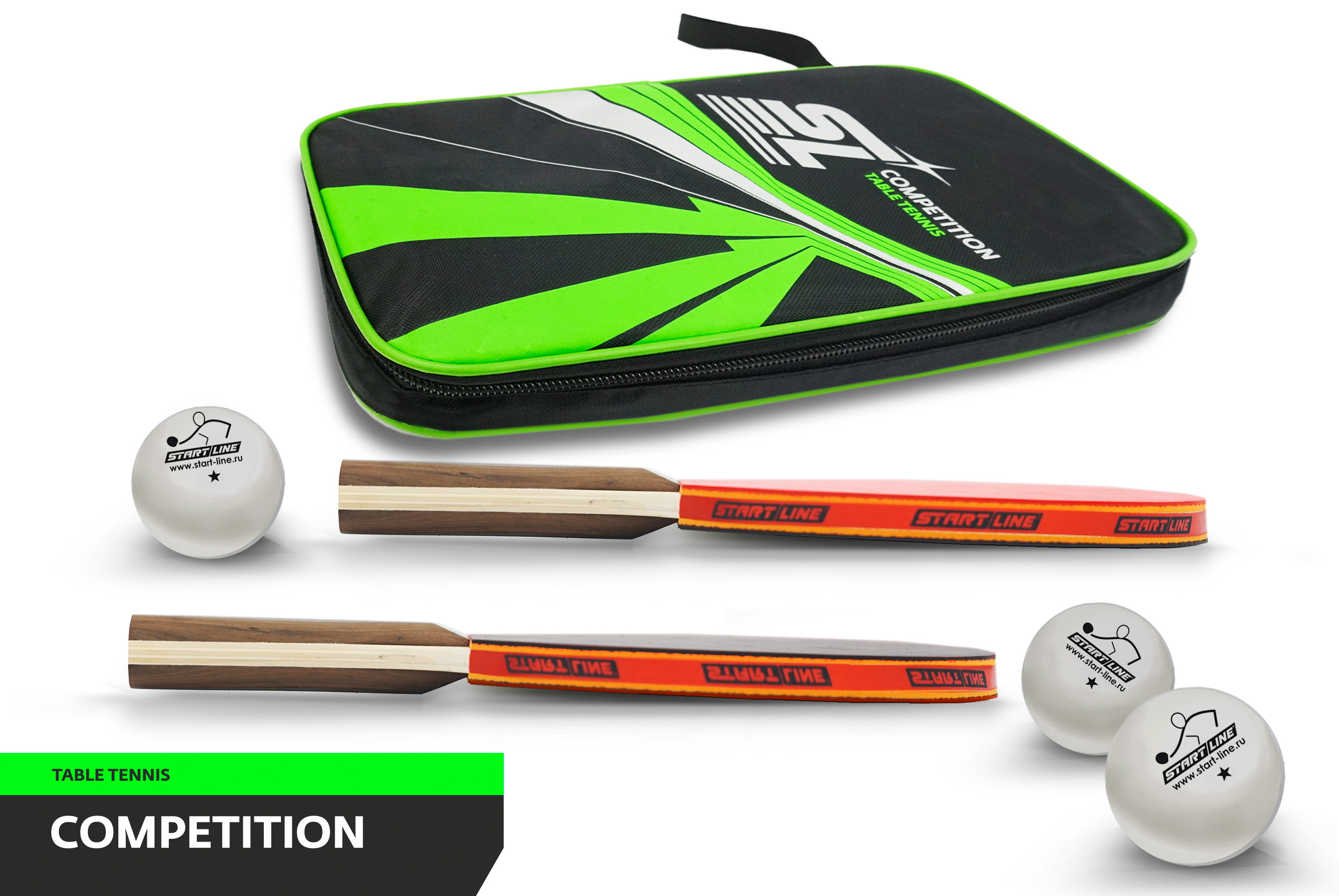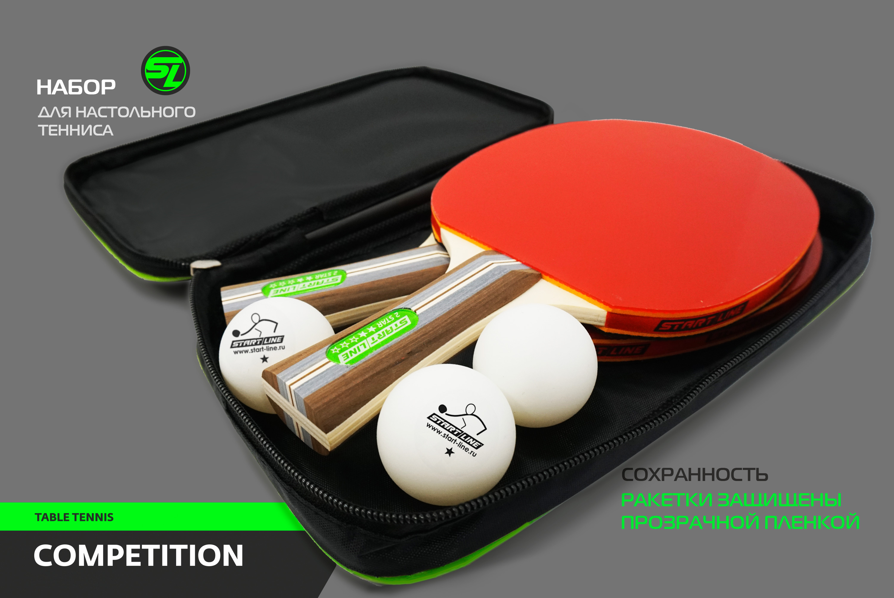 Набор для настольного тенниса Startline COMPETITION включает 2 ракетки и 3 мяча. Start Line заботится о сохранении продукции и удобстве игроков, поэтому набор упакован в компактную сумку с ручкой и замком-молнией. Набор удобно брать собой, а целостность инвентаря сохранится. Ракетки дополнительно защищены прозрачной плёнкой.