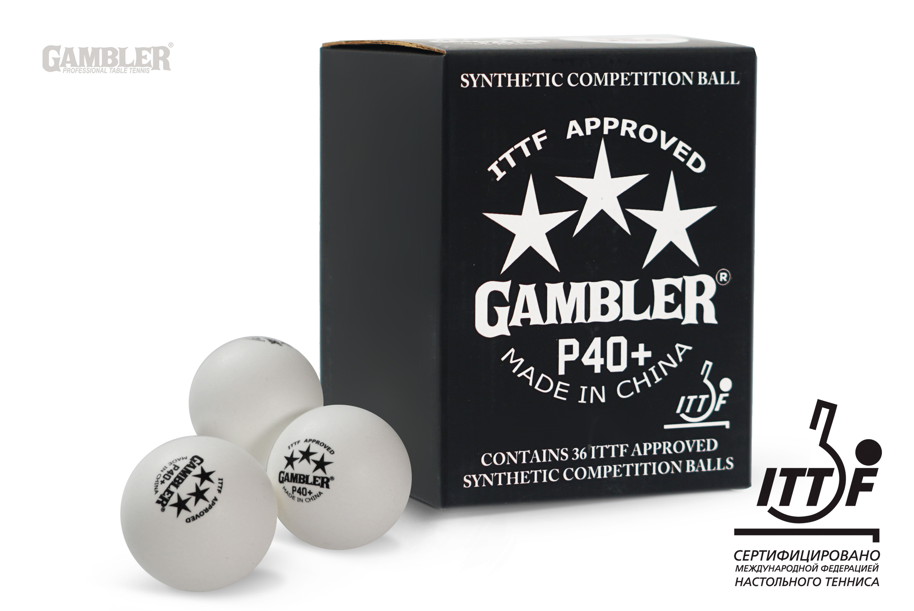 Gambler P40+ - полностью синтетические мячи для соревнований, одобренные Международной федерацией по настольному теннису (ITTF). P40+ разработан для большей продолжительности вращения и обладает превосходной прочностью по сравнению с обычными конструкциями из полиэстера или АБС. Gambler P40+ были независимо разработаны и произведены компанией Gambler, что обеспечивает превосходное качество и игровые возможности. В мячах Gambler используется специальное соотношение смолы АБС, что делает их более твердыми и быстрыми, как популярные мячи из Японии. Мячи обладают быстрым вращением, высокой скоростью и полностью являются синтетическими (НЕ ЦЕЛЛУЛОИДНЫМИ). Gambler внес изменения в собственный производственный процесс: конструкция состоит из 2 частей и эти мячи используются почти на каждом профессиональном соревновании по всему миру.