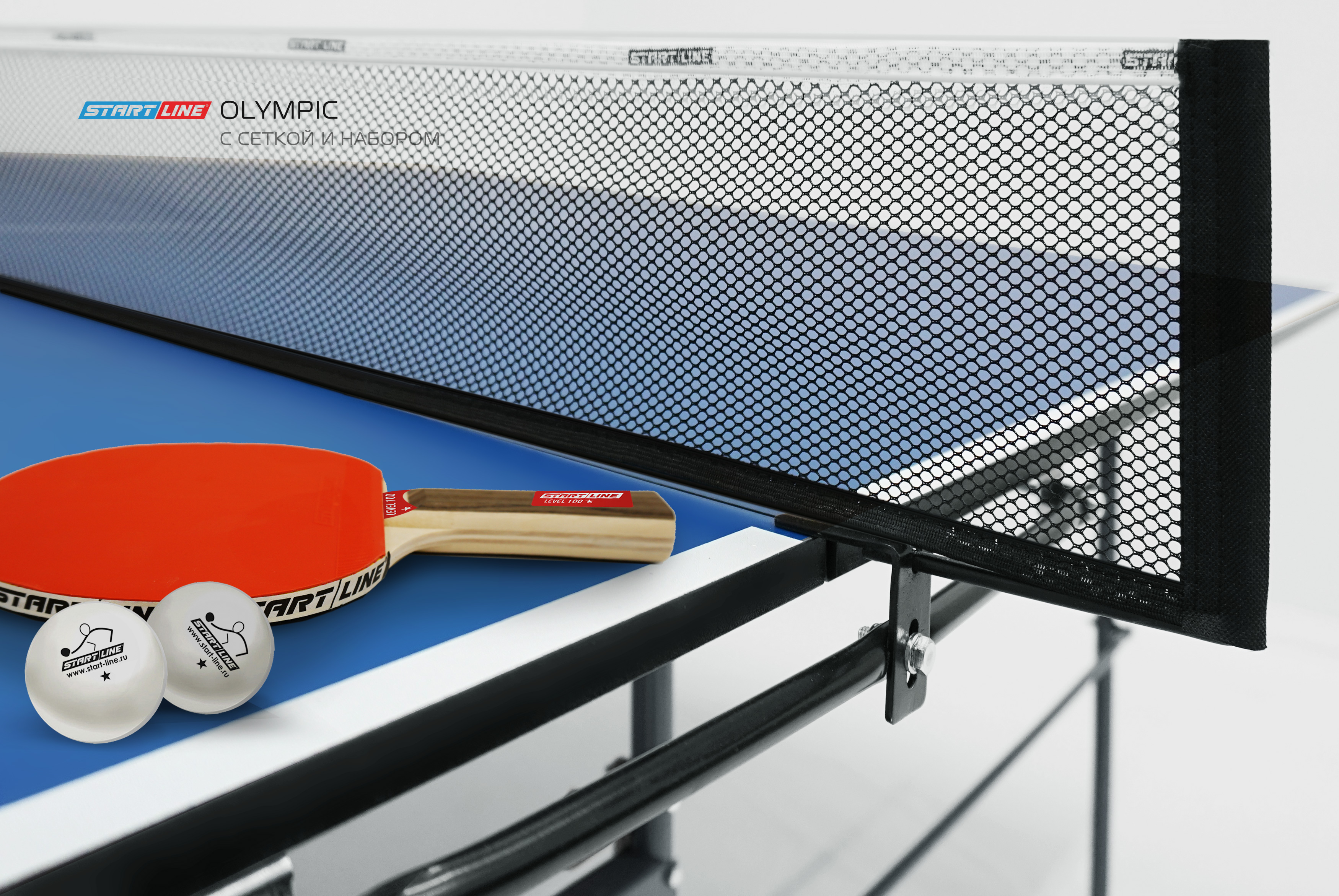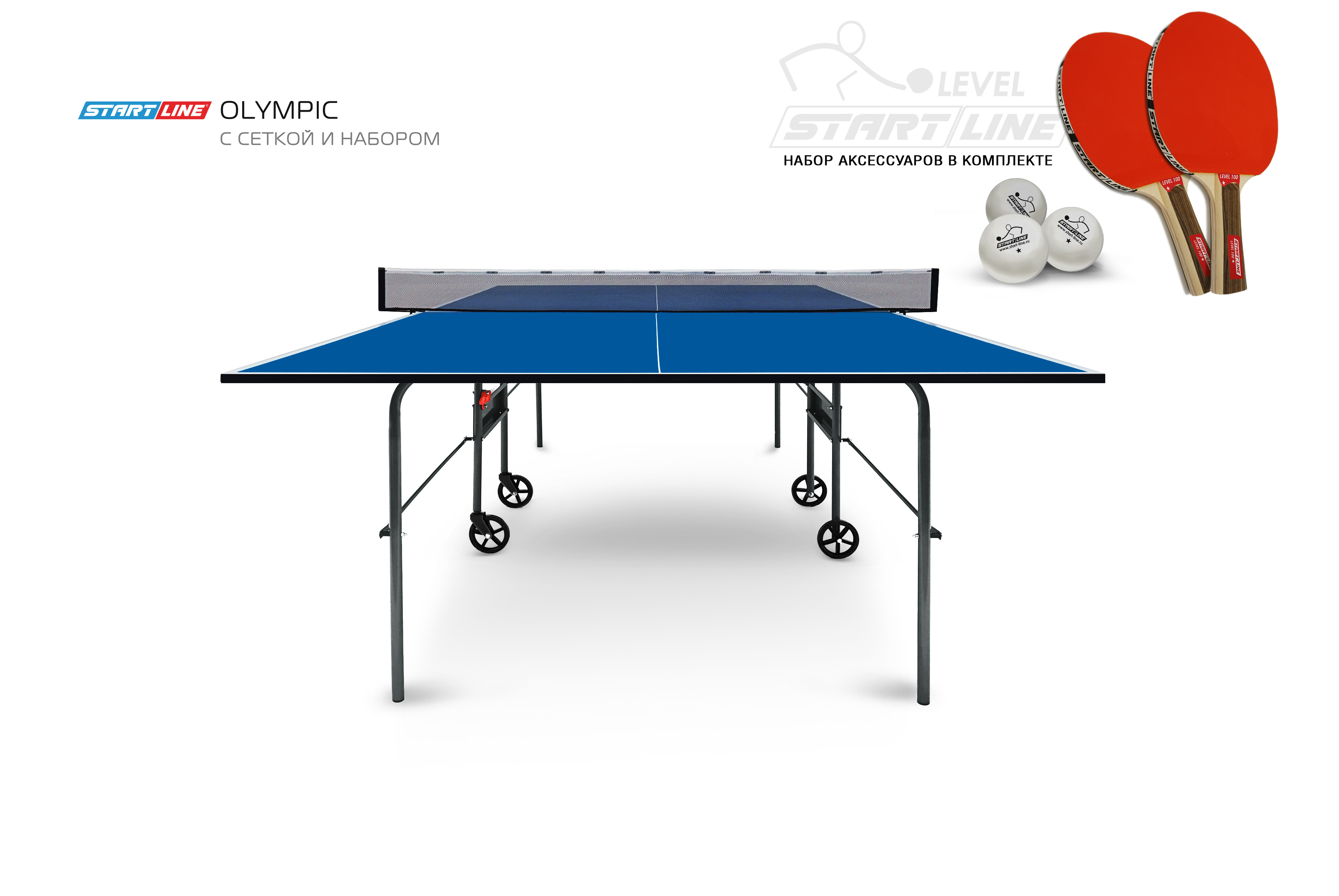 Olympic оборудован встроенной сеткой, не требующей демонтажа при складывании. В комплекте со столом идет набор со всеми необходимыми для игры аксессуарами: 2 ракетки Level 100, 3 теннисных мяча Club Select.