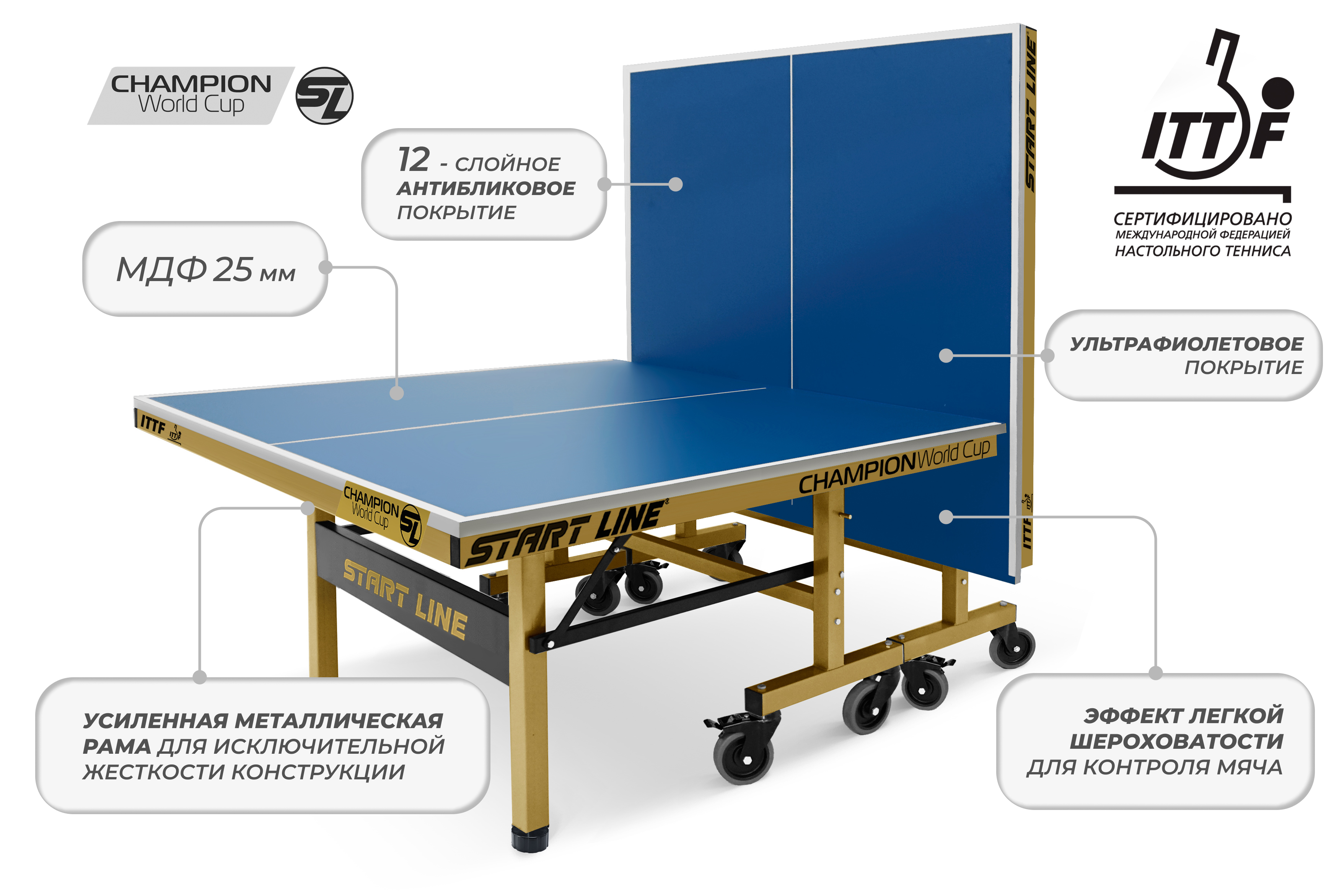 Теннисный стол Champion World Cup — новое прочтение стола Champion, который сертифицирован ITTF (Международной федерацией настольного тенниса), что подтверждает его соответствие стандартам для проведения профессиональных соревнований.