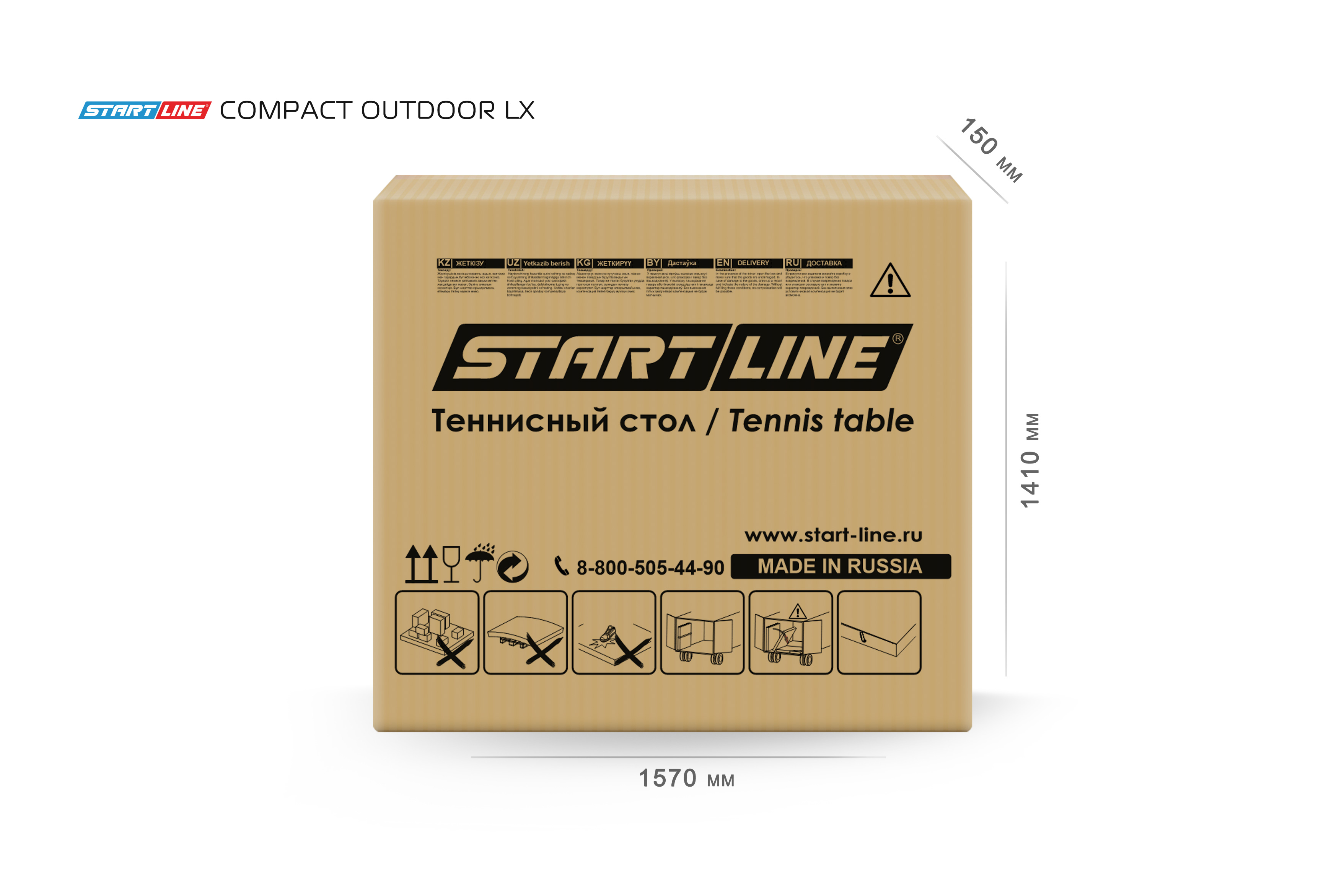Размер стола в рабочем положении: 274 см в длину, 152,5 см в ширину и 76 см в высоту, что соответствует стандарту ITTF.