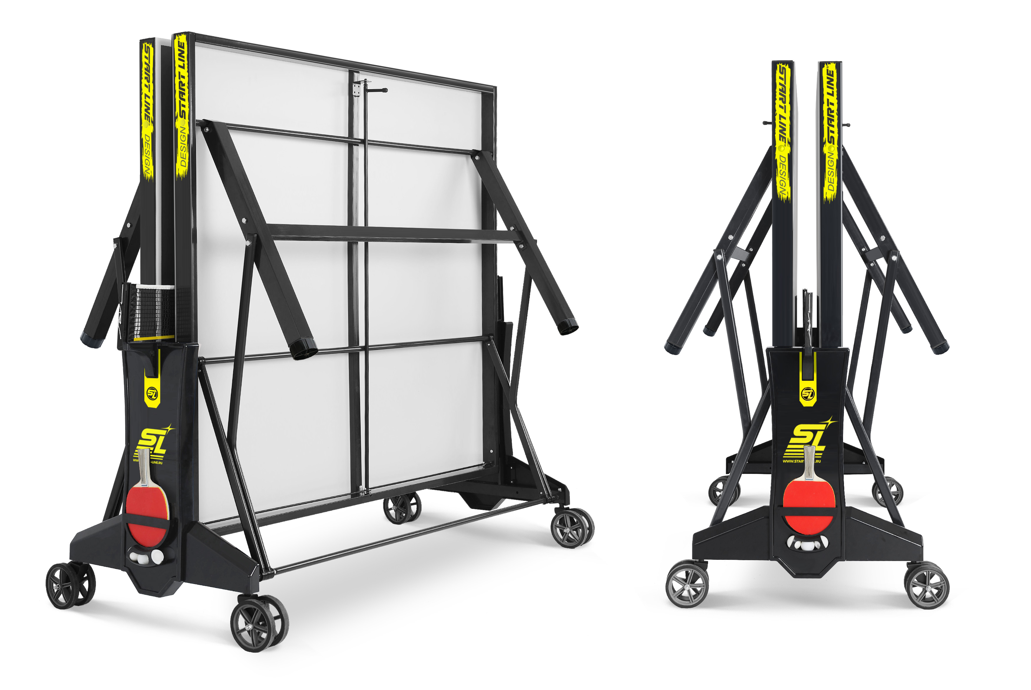 Комфортная система складывания стола является собственной разработкой Start Line. Она предусматривает усовершенствованный механизм, позволяющий быстро и надежно закрепить положение стола как в разложенном, так и в сложенном виде. Все манипуляции производятся с рабочего места игрока для каждой из столешниц. С такой системой складывания легко справляется один человек, а стол при хранении занимает минимум пространства. Конструкция предусматривает дополнительную фиксацию в сложенном виде безопасной транспортировки стола, а также возможность одиночной игры.
