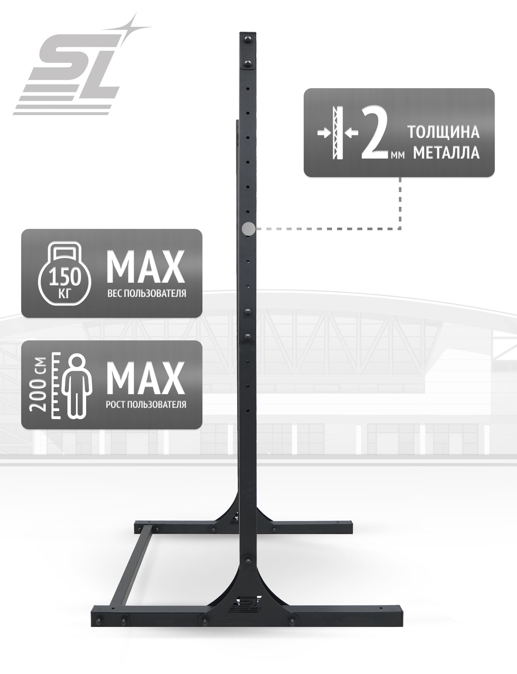 В основании установлены усиленные косынки толщиной 3 мм, которые гарантируют высокую стабильность и исключают люфт даже при интенсивных нагрузках. Конструкция оснащена защитными заглушками на всех открытых торцах и местах крепления – травмы и повреждения пола исключены.