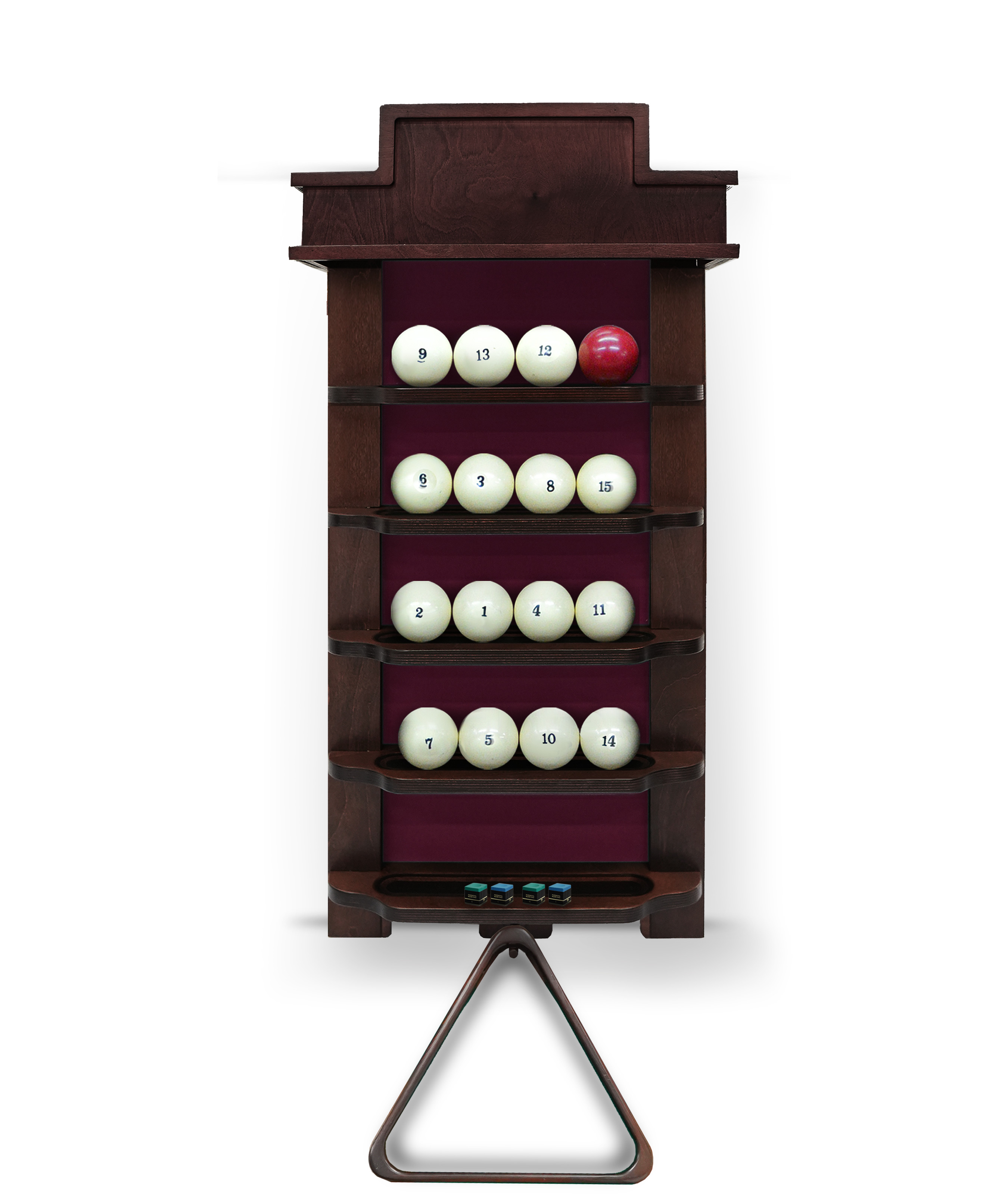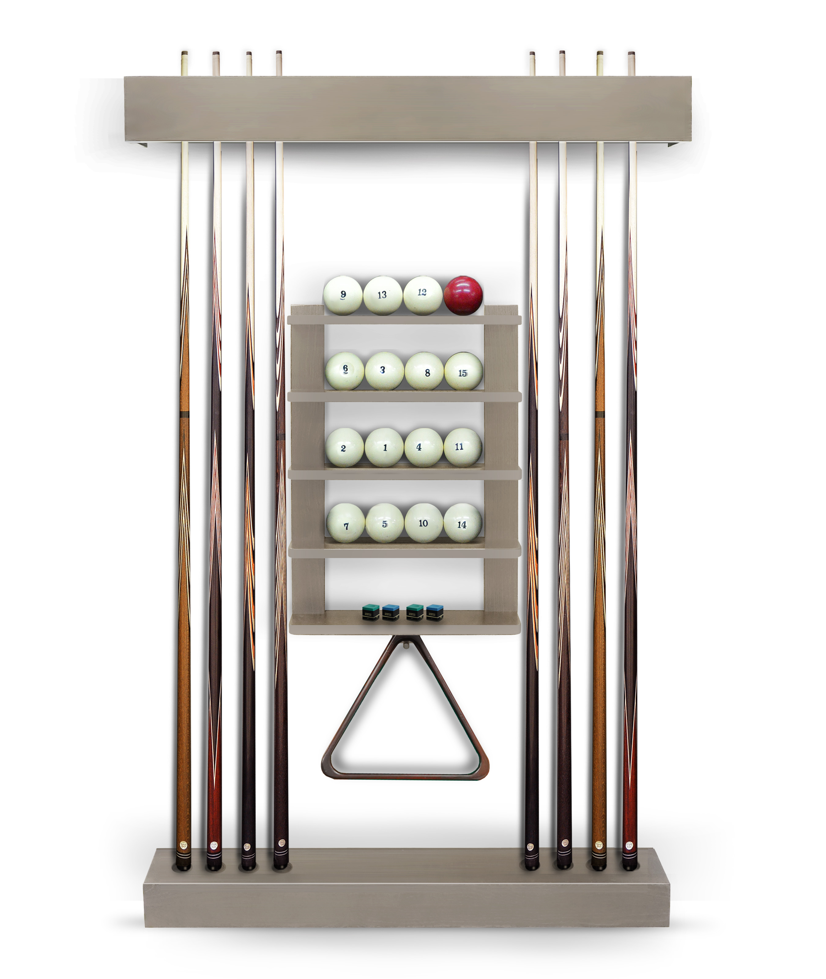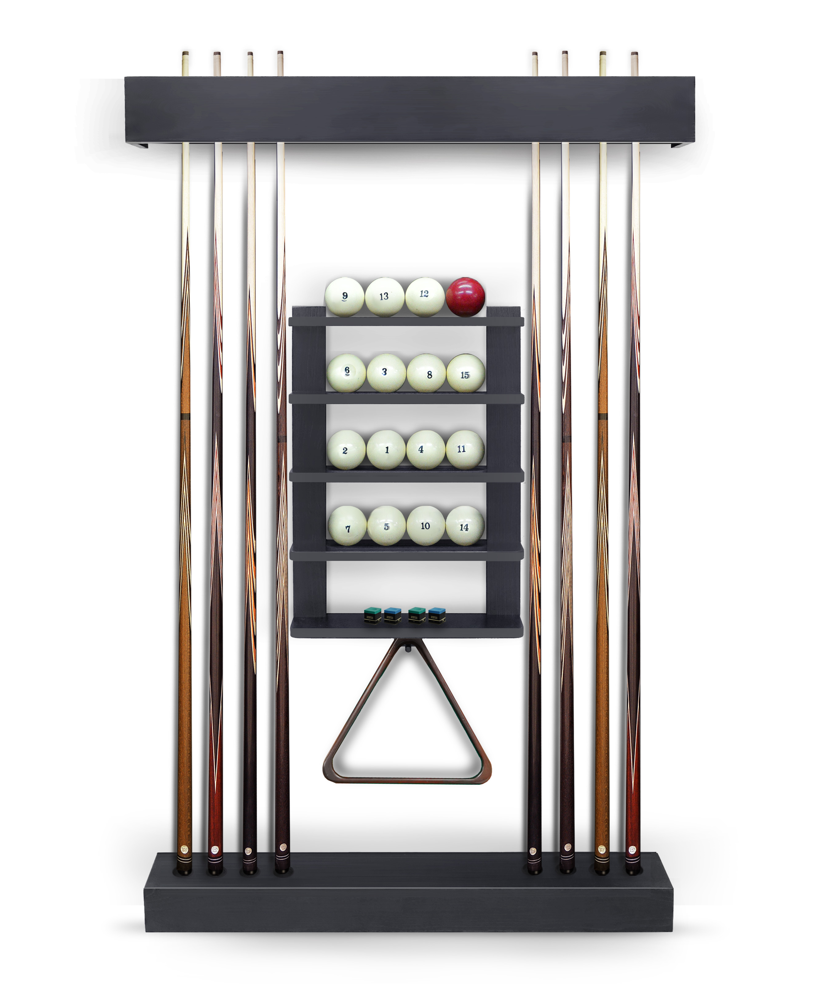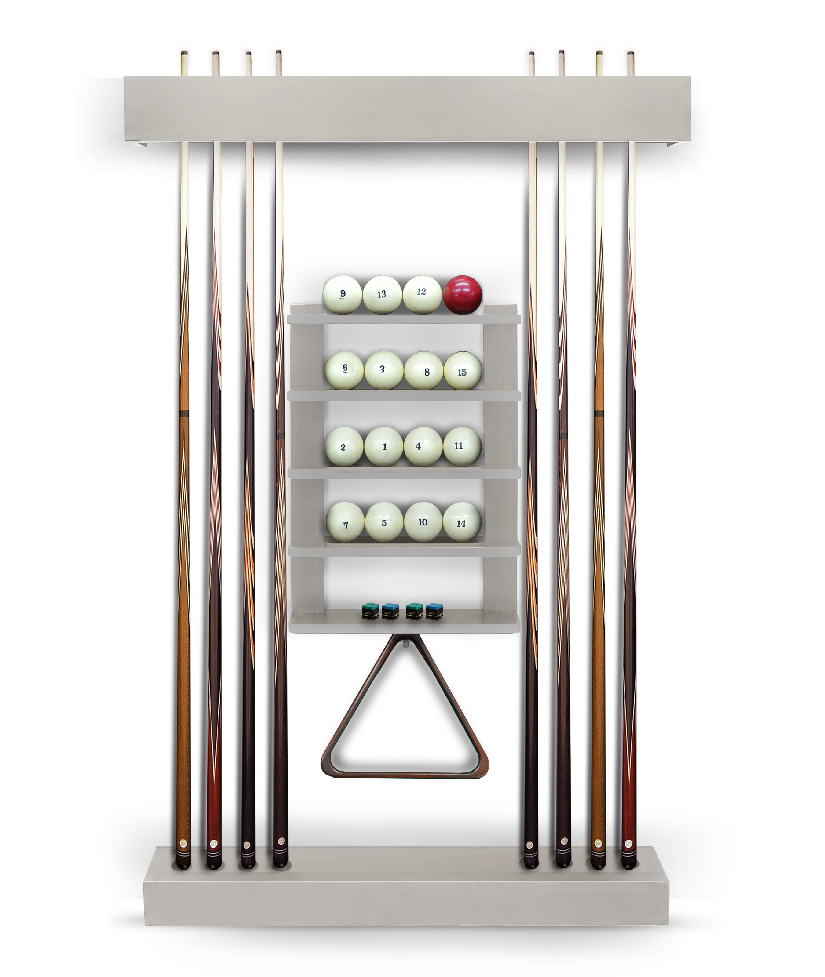 Полки оснащена держателем для треугольника и пятью полками, четыре из которых вмещают полный комплект шаров. На дополнительной пятой полке можно расположить мелки, наклейки, насадки и другие необходимые для игрока аксессуары.