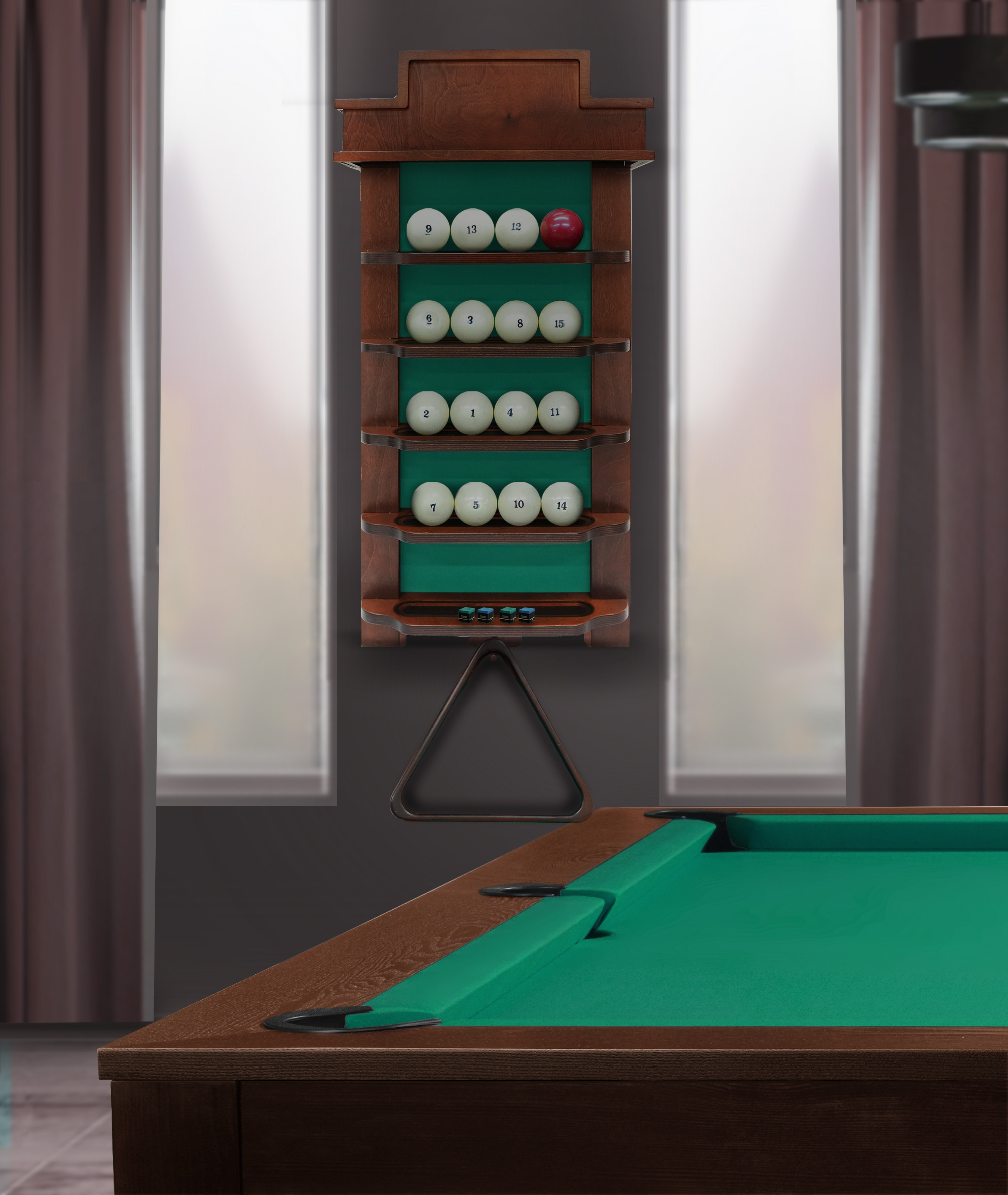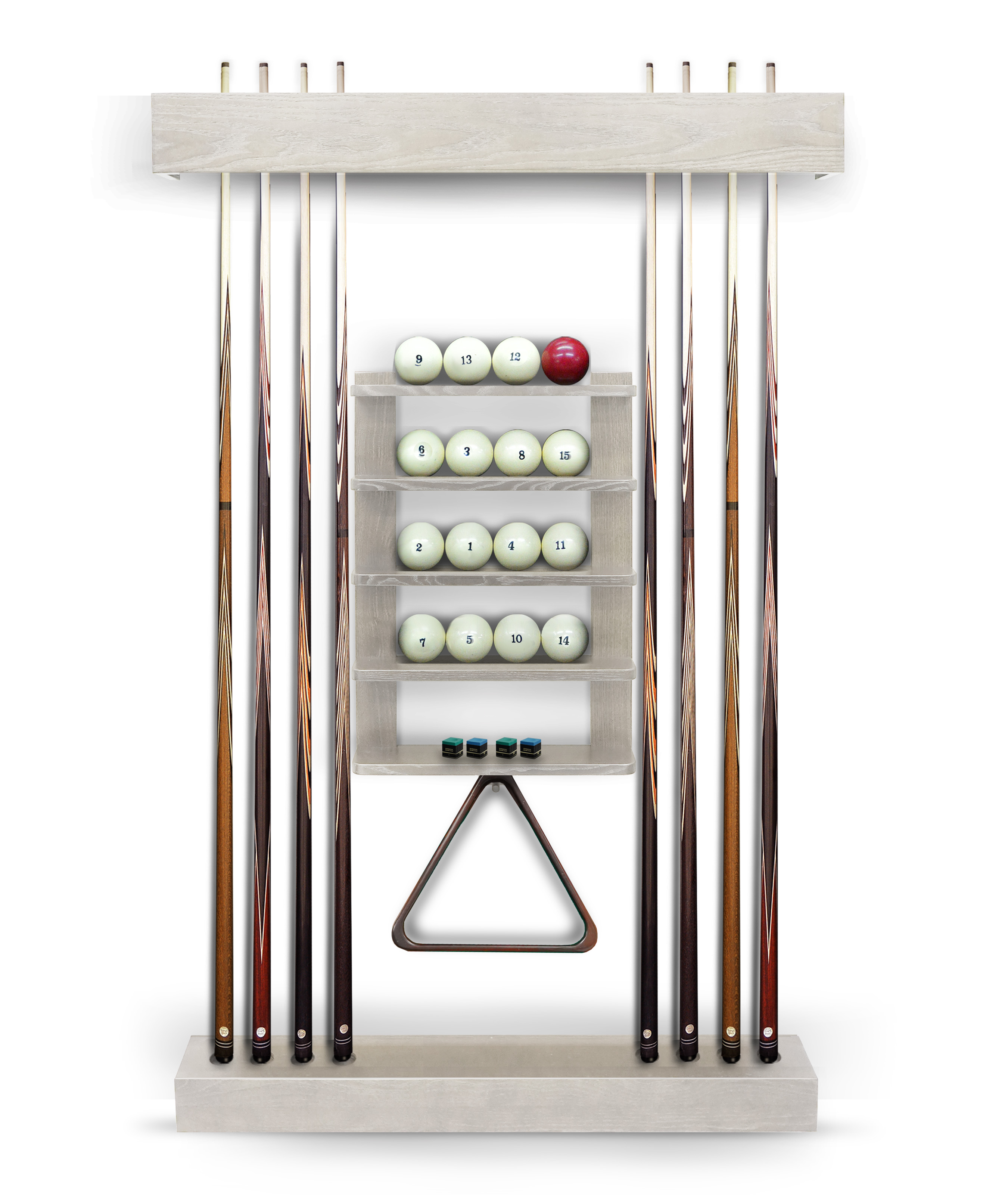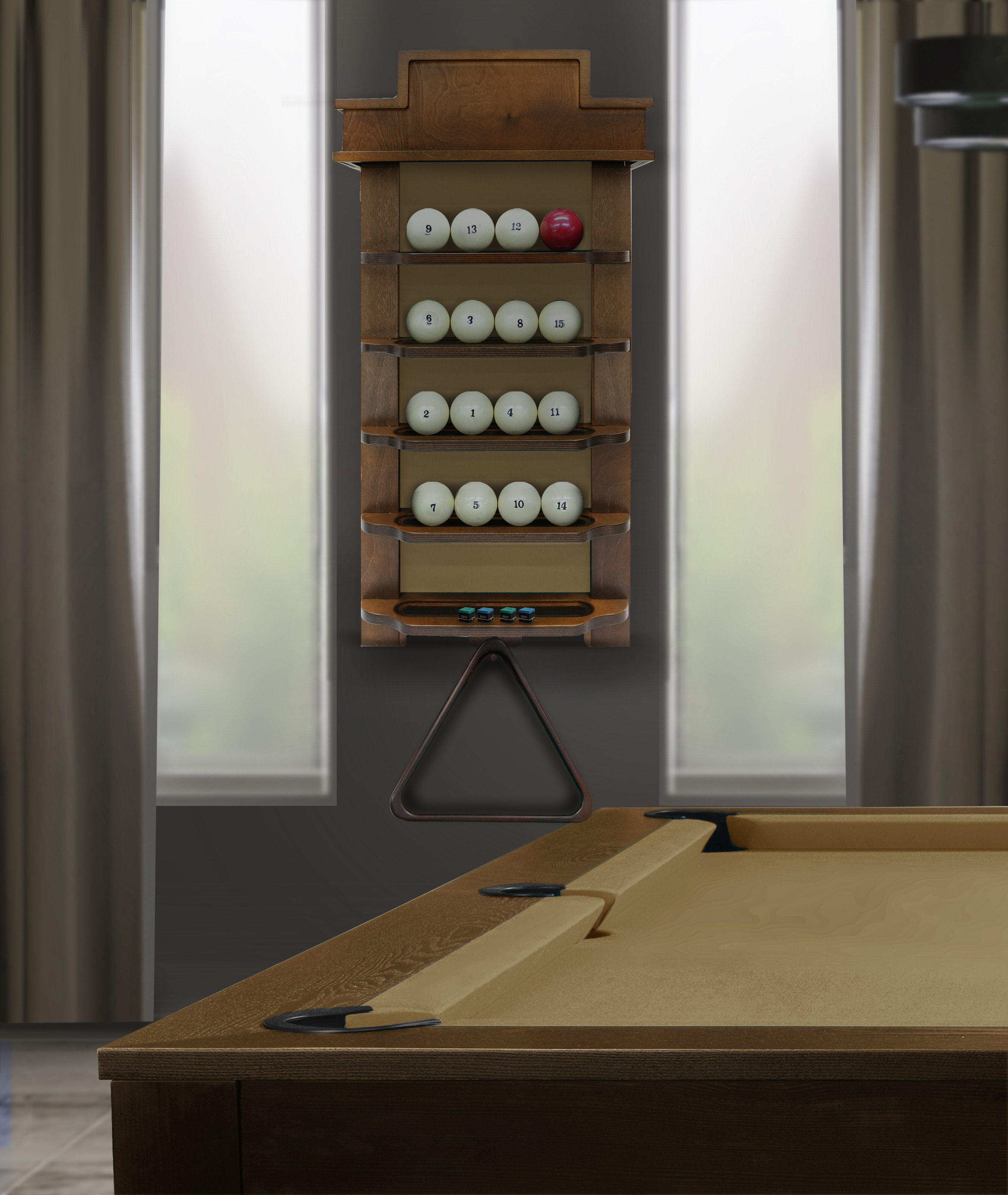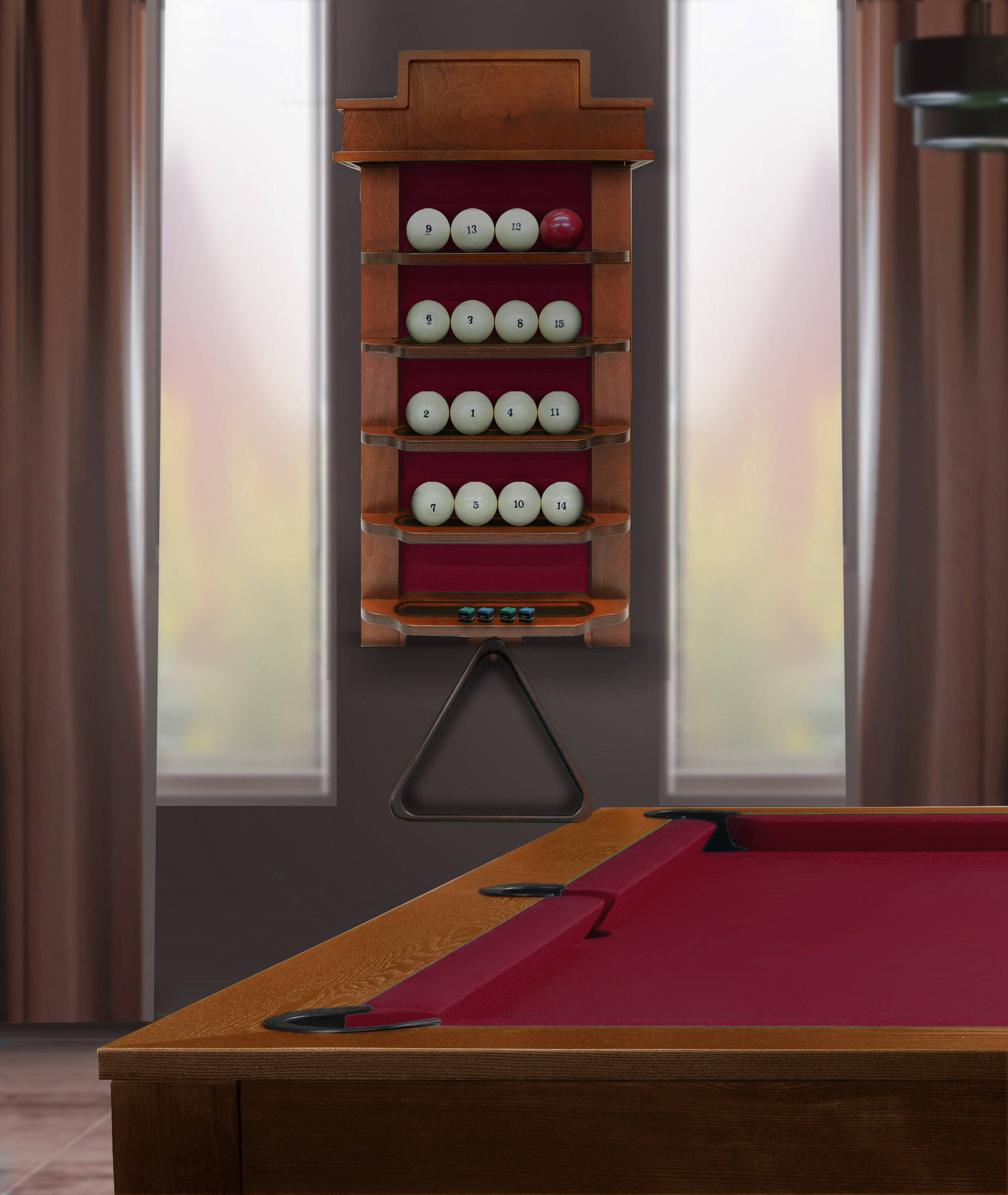 Полки оснащена держателем для треугольника и пятью полками, четыре из которых вмещают полный комплект шаров. На дополнительной пятой полке можно расположить мелки, наклейки, насадки и другие необходимые для игрока аксессуары.