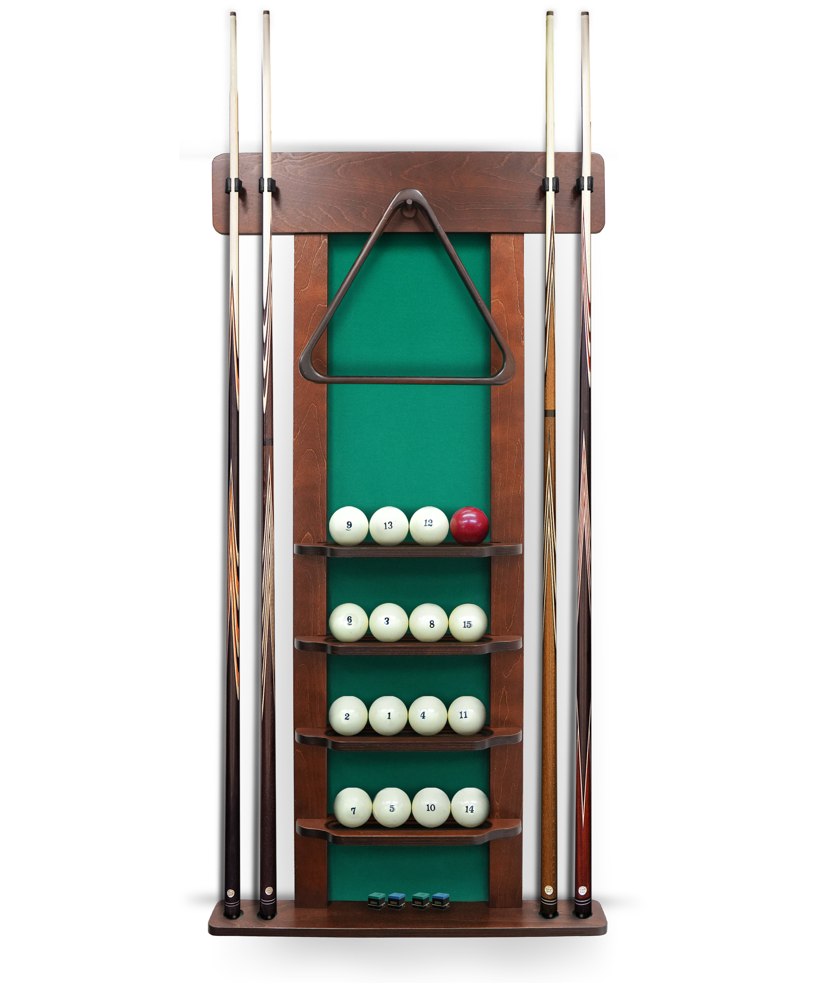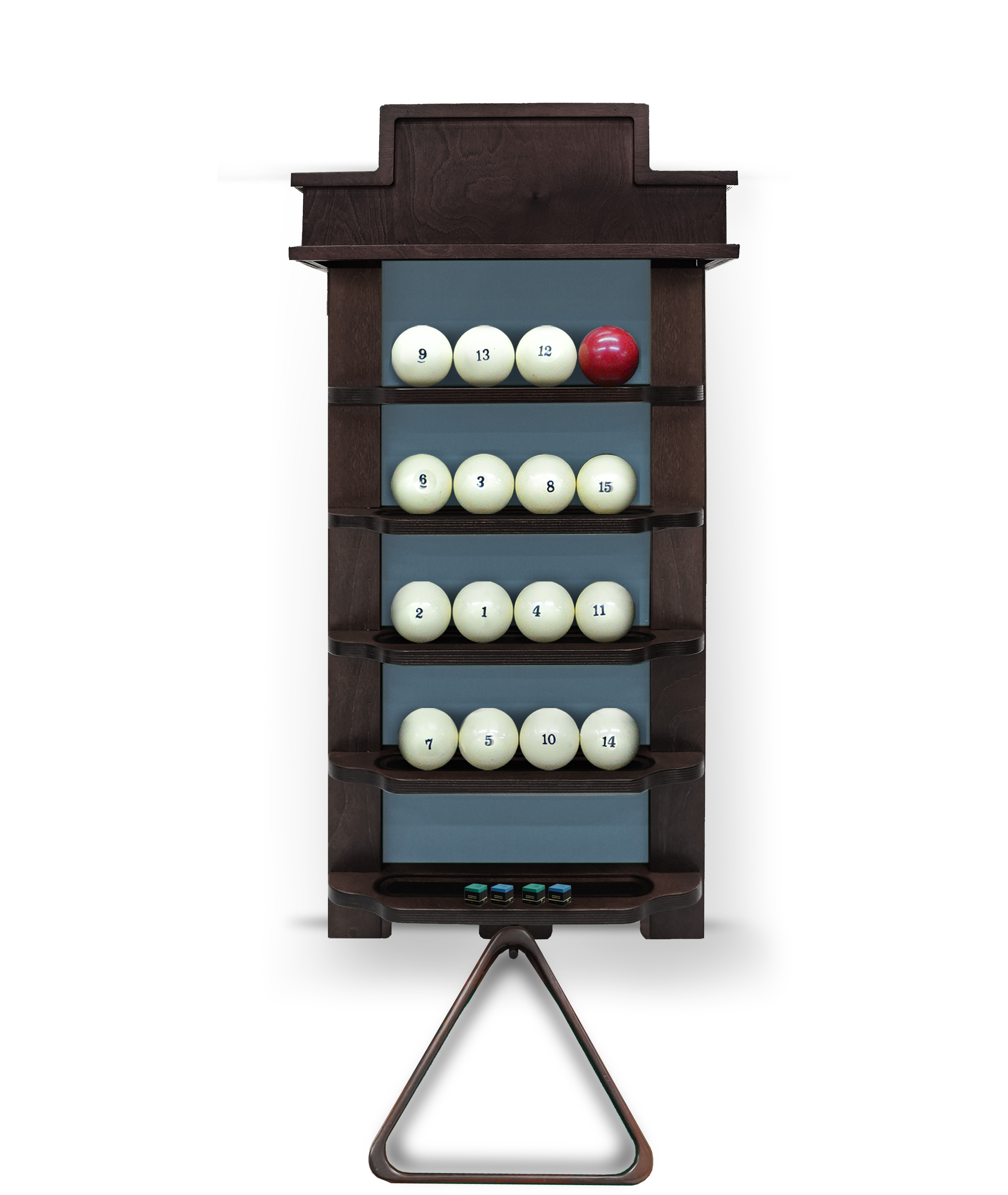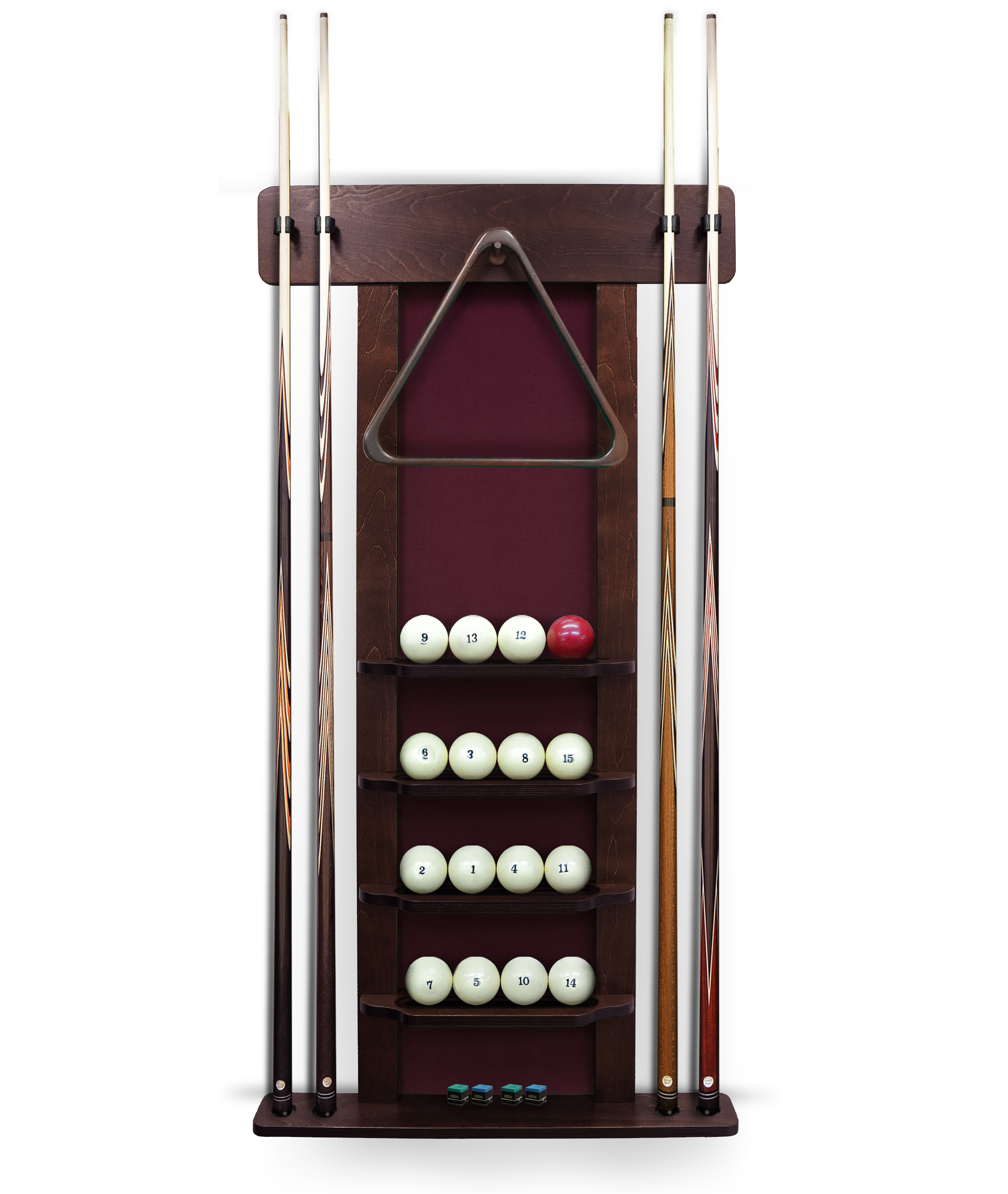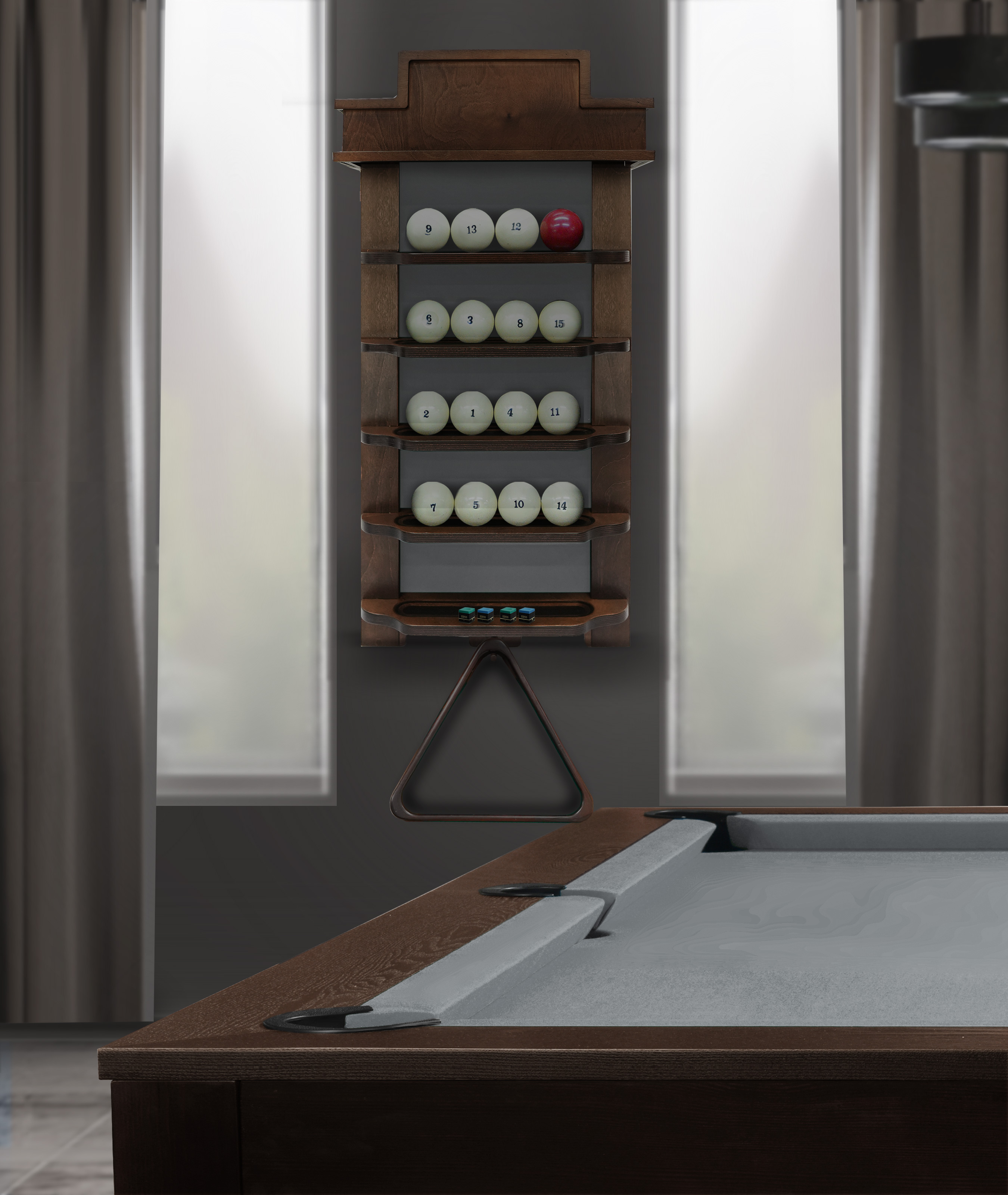 Полки оснащена держателем для треугольника и пятью полками, четыре из которых вмещают полный комплект шаров. На дополнительной пятой полке можно расположить мелки, наклейки, насадки и другие необходимые для игрока аксессуары.