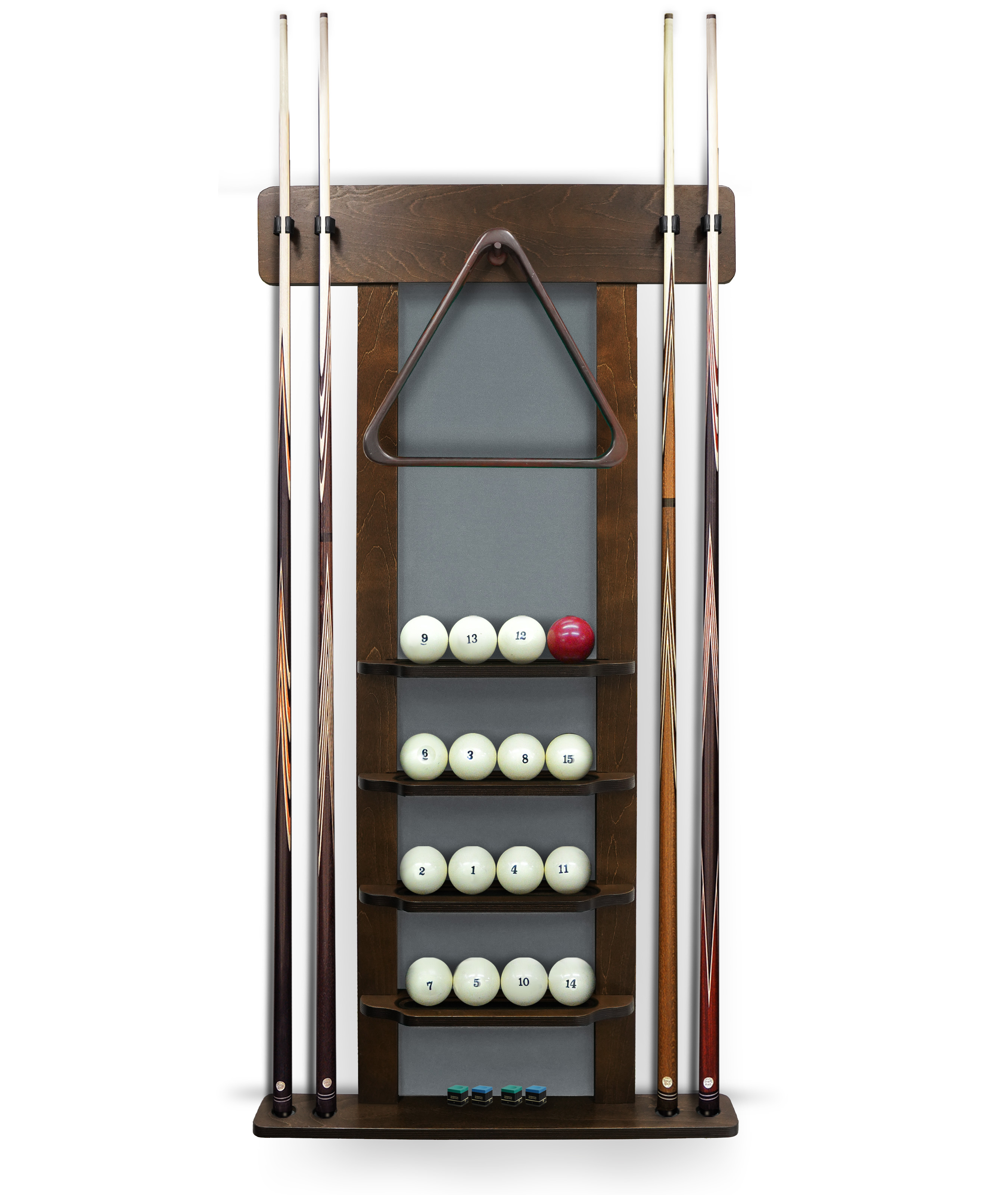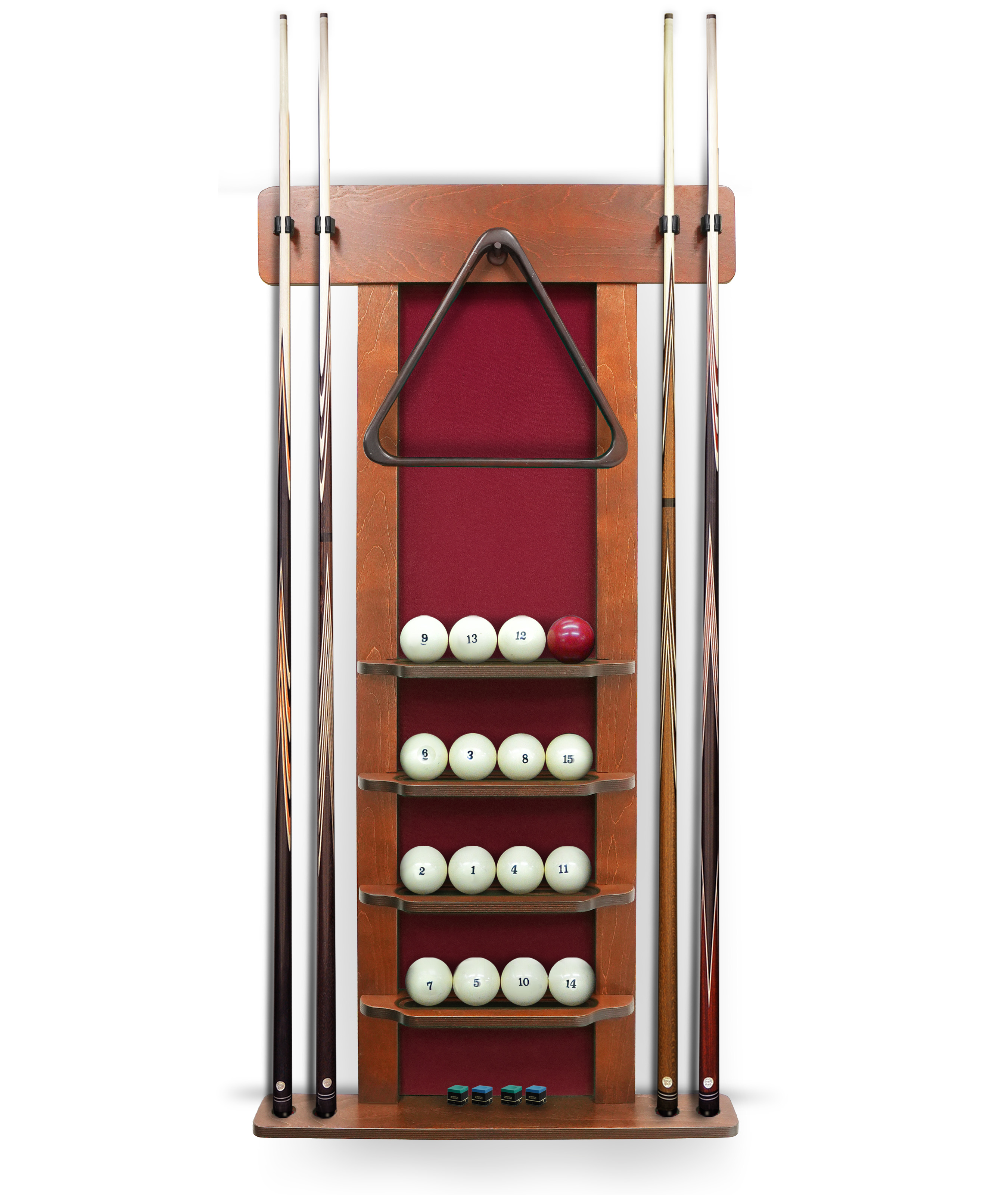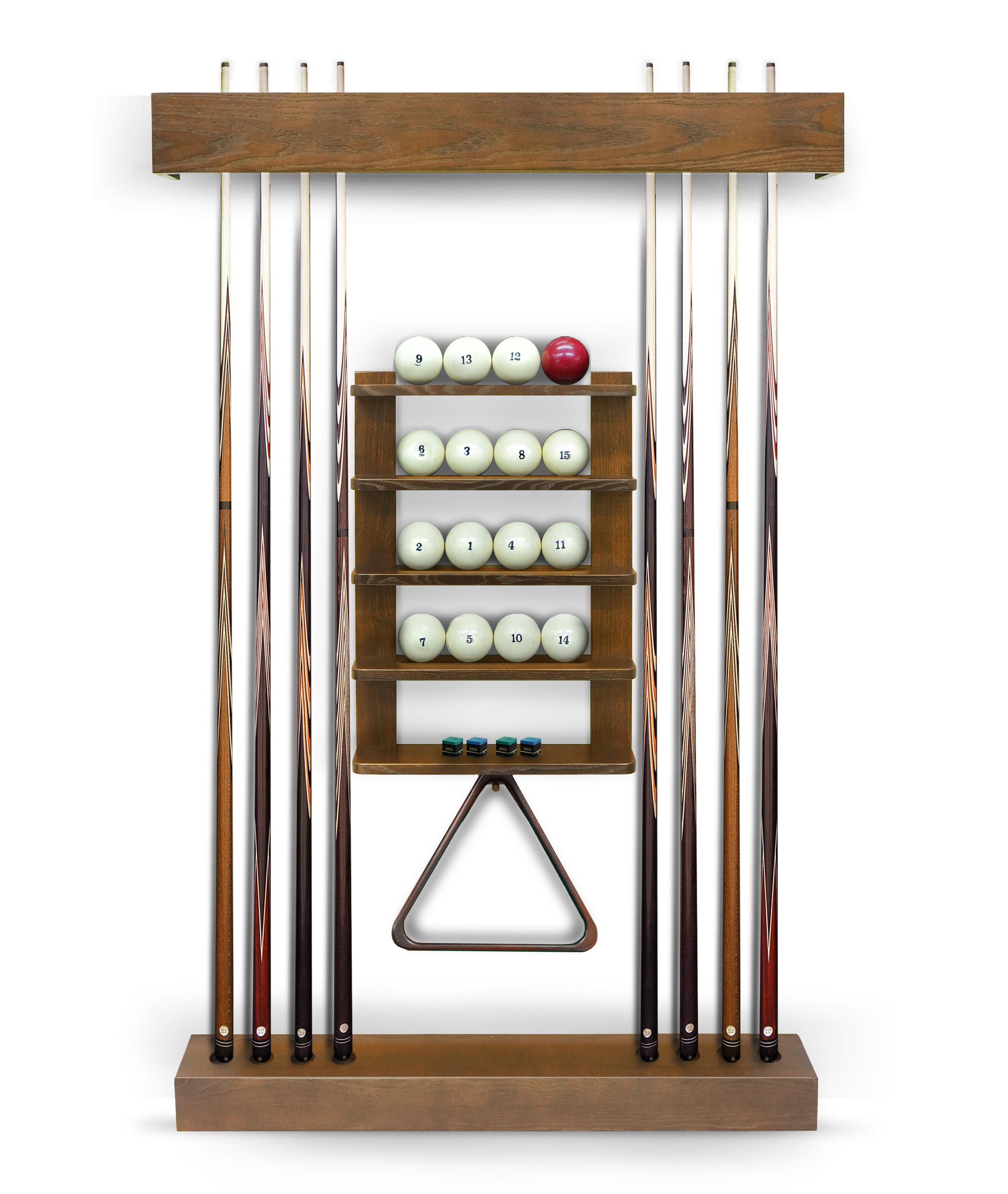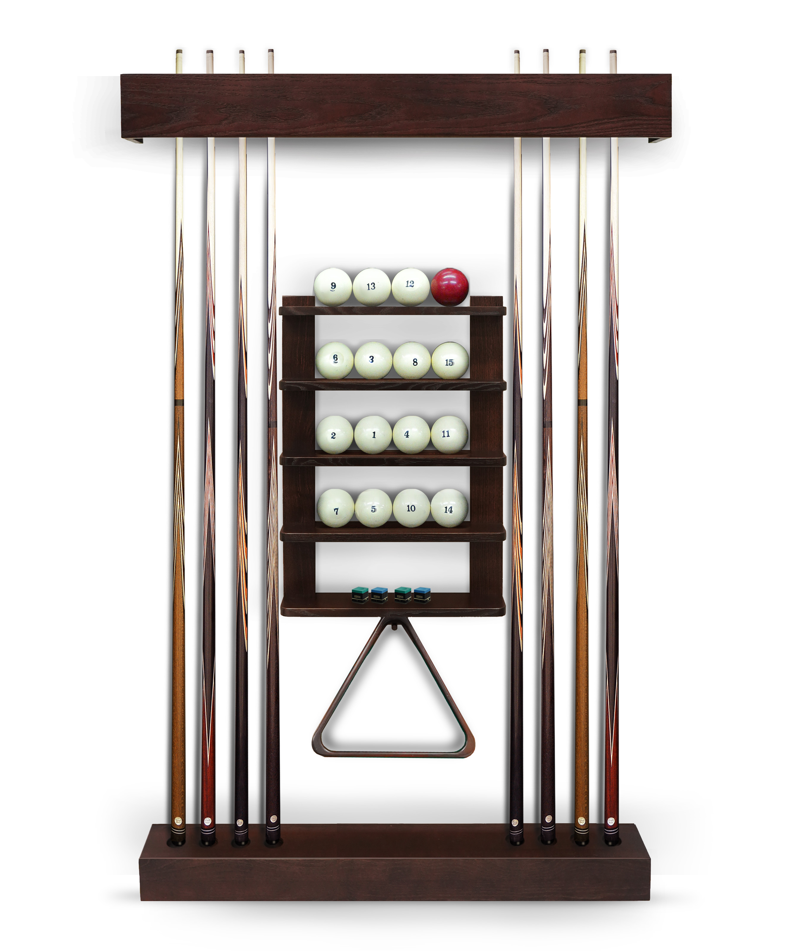 Полки оснащена держателем для треугольника и пятью полками, четыре из которых вмещают полный комплект шаров. На дополнительной пятой полке можно расположить мелки, наклейки, насадки и другие необходимые для игрока аксессуары.