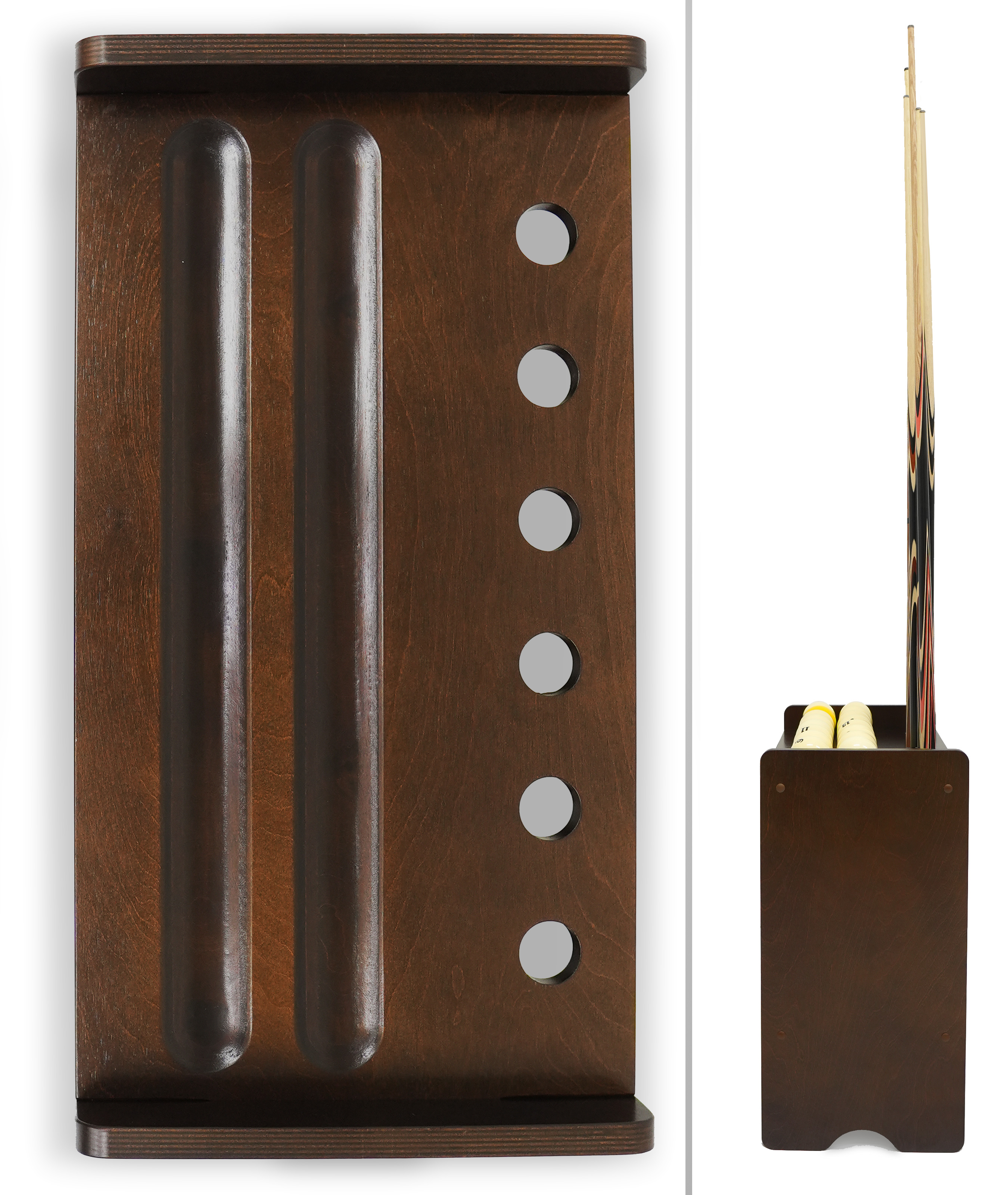 Киевница изготовлена из высококачественной фанеры, что обеспечивает изделию долговечность и устойчивость к деформации. Компактная и устойчивая напольная модель не требует дополнительной фиксации и подходит для размещения вблизи бильярдных столов.