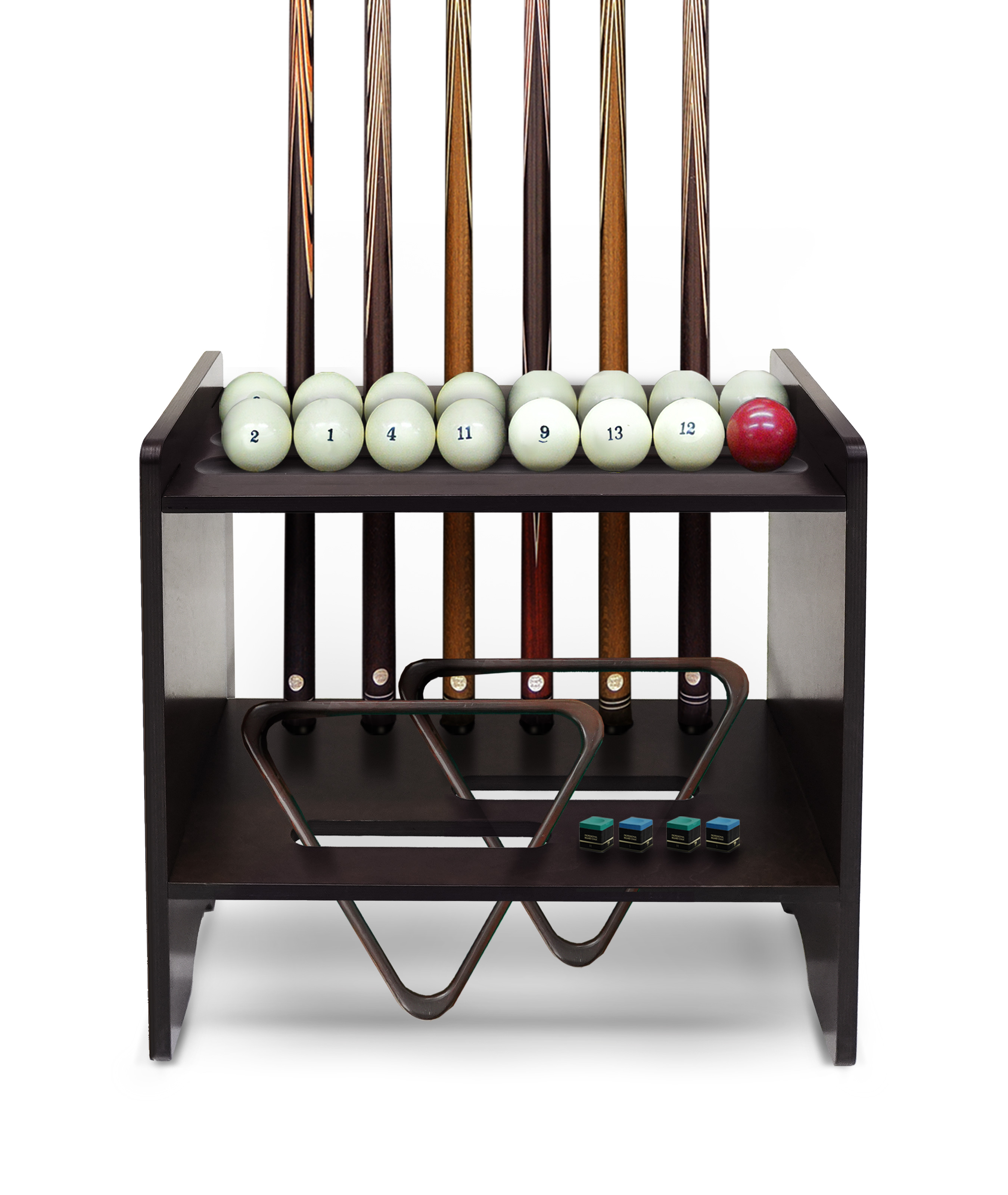 Продуманная конструкция киевницы вмещает 6 киев, а также полный комплект шаров, треугольники и мелкие аксессуары. Все всегда под рукой и в идеальном порядке.